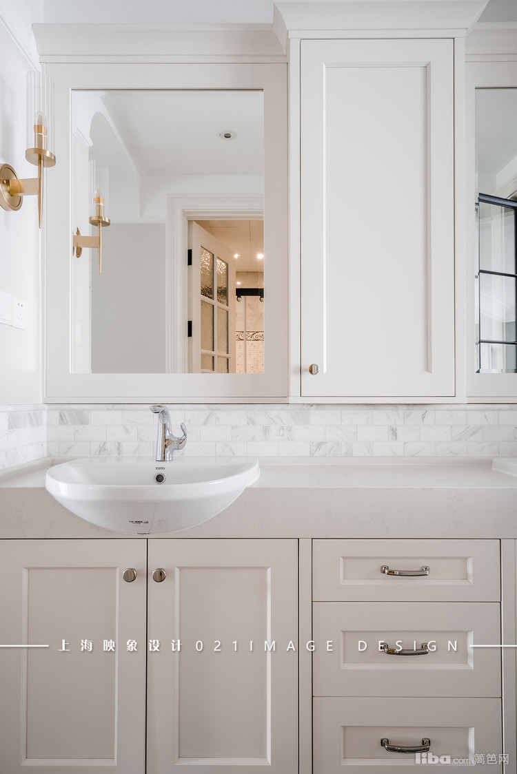 卫浴同样以线板元素打造柜体,不同的是多了更多亮面磁砖,使其容易清扫打理,也为恬淡的居家挹注低调的华丽。