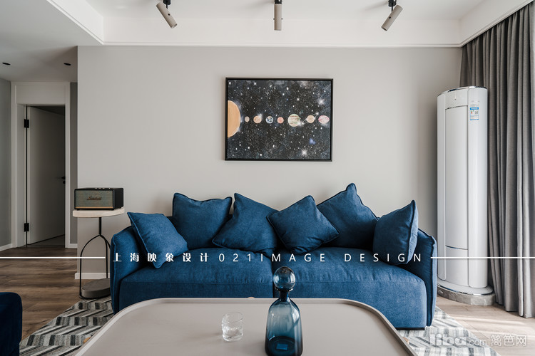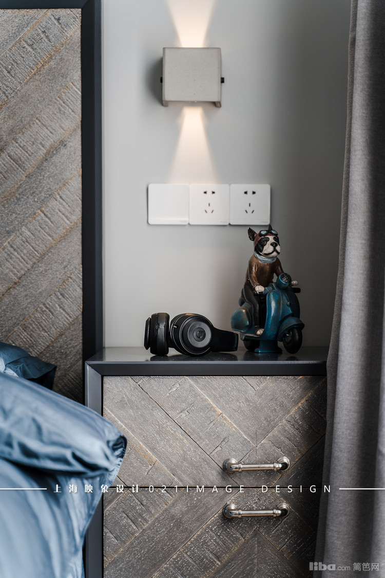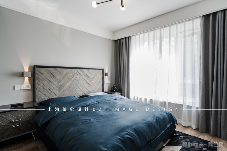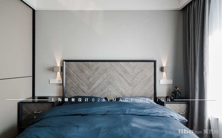 卧室的色调和客餐厅基本一样,仍然沿用黑白灰三色,只是在软装上搭配了深蓝色。