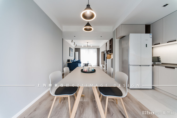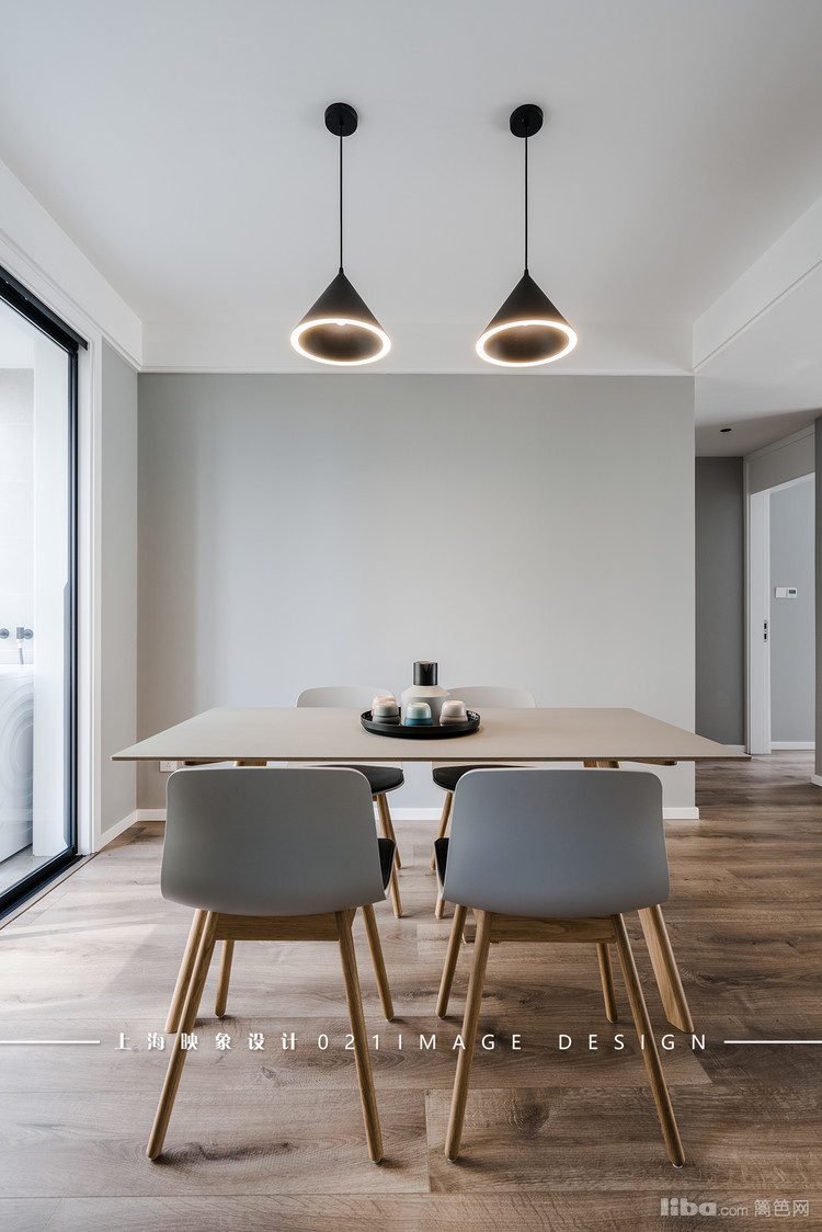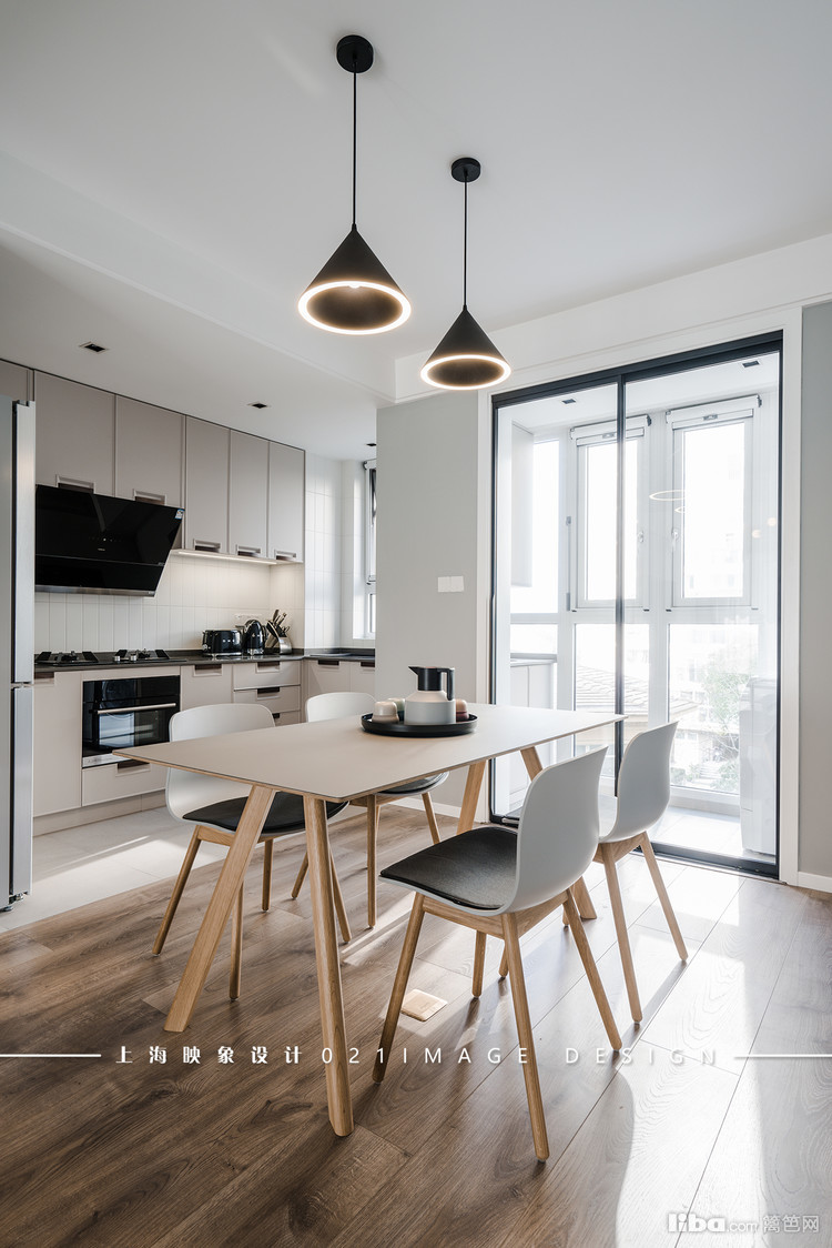 厨房做成开放式的,在视野上,餐厅的面积无形扩大了。小阳台和餐厅中间的移门改成细边框的黑色铝合金移门,大面的玻璃把阳台里的阳光带到了这里。
