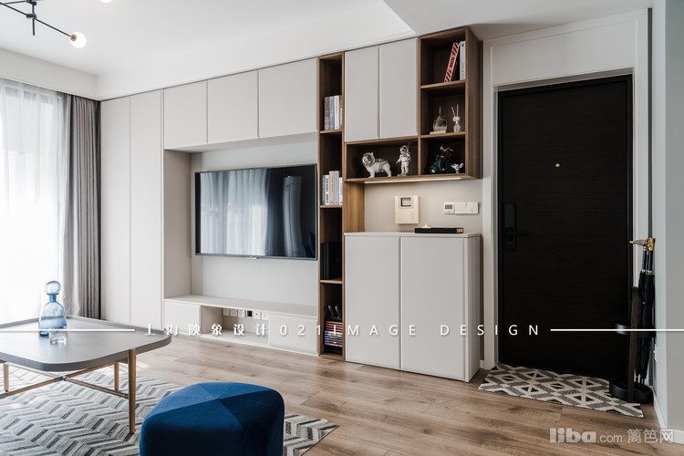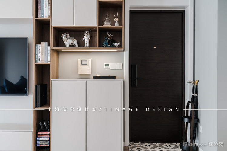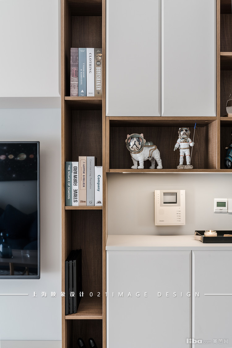 设计师让靠近入户门的这一整面墙都作为收纳储物区域。白色的柜门配上木色的隔板,色调上显现出一份静逸的美,功能上让主人的小手办们都有了存放之地。