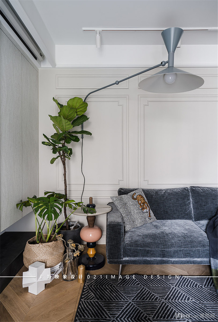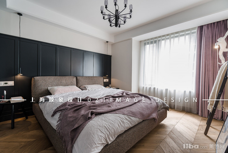 主卧室是设计师兼业主设计中最纠结的一处空间,卧室的床头设计了一面美式的深色护墙板,床头摒弃了传统的床头柜。白色的连框开关插座嵌在护墙板上,干净又美观。