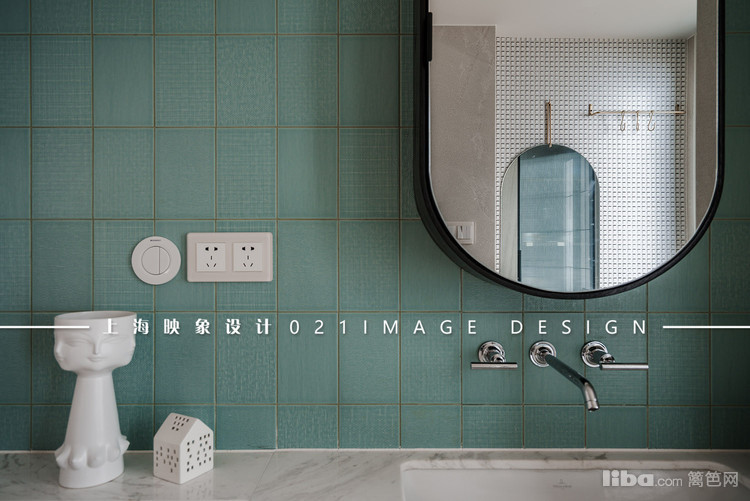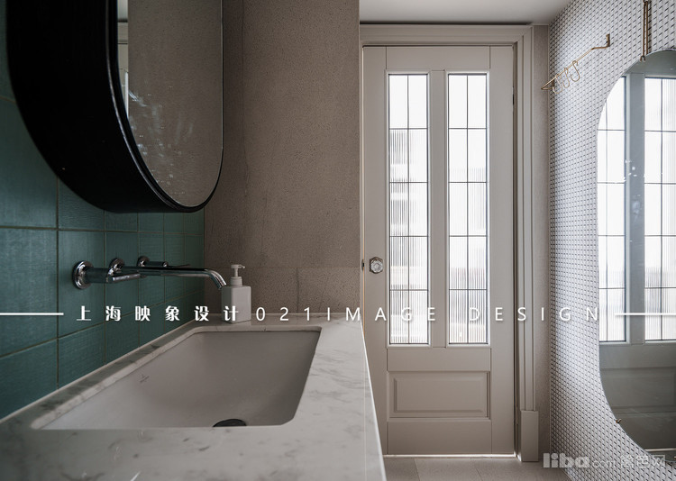 干湿分离的区域,设计师选用了壁纸贴于门后,挂上一面穿衣镜方便了女主人的装扮需求,也呼应了台盆上的镜柜的款式。