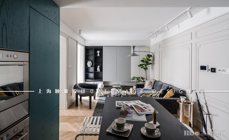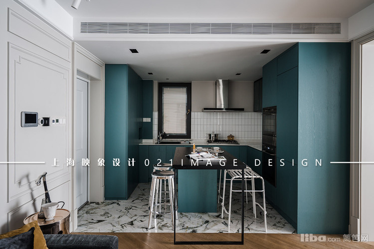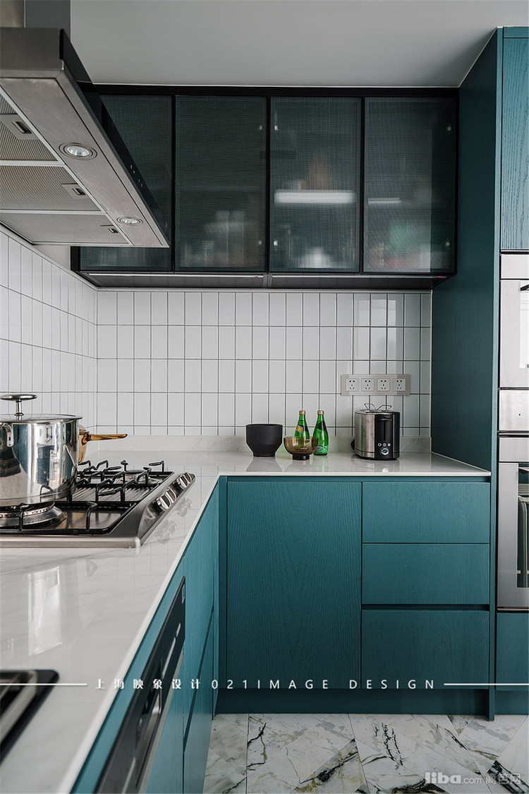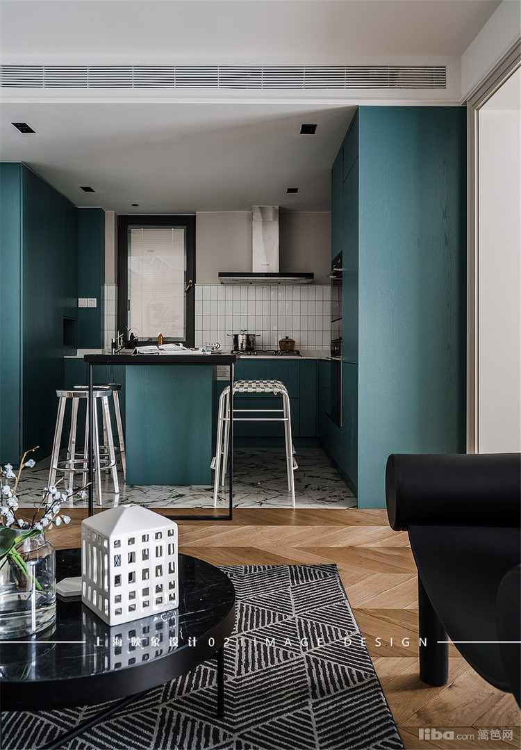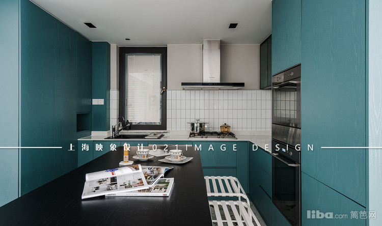 厨房的整体色调是墨绿色,橱柜做了无拉手设计,冰箱内嵌用BLUM的电动碰碰开,轻轻一触就可打开门板了,日常使用很有舒适度,高科技的植入有利于生活品质的提高。