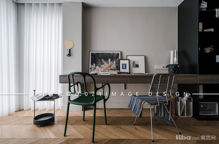 书桌的对面就是卫生间和主卧室,简单的生活起居动线顺理成章。两扇门中间设置一个边柜,一面中式味道的背景墙提升了书房的韵味。