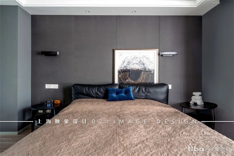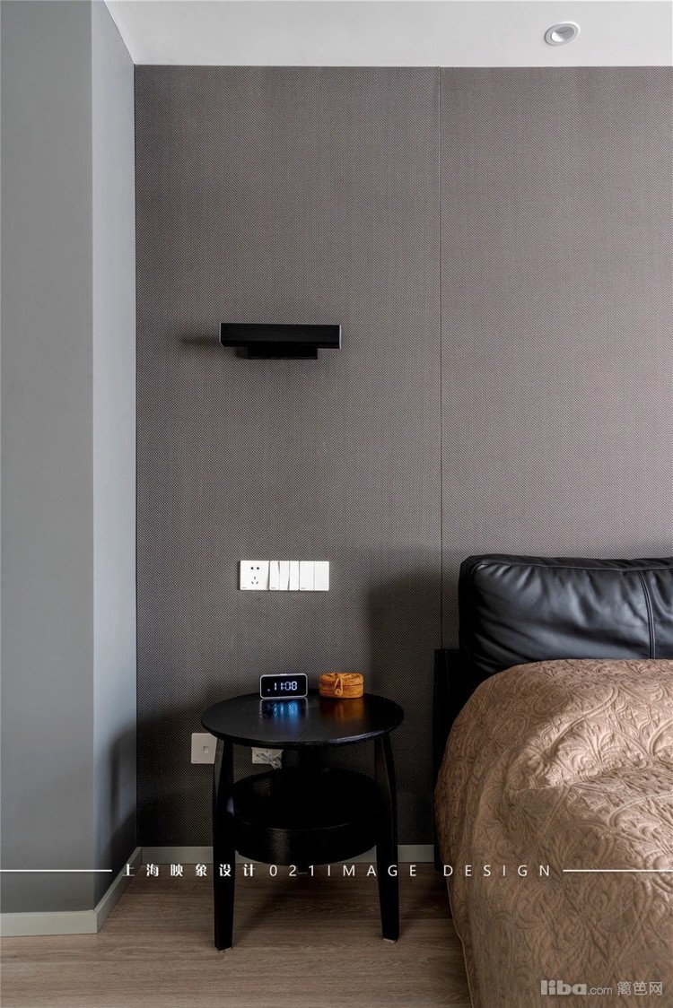 黑色作为整体空间不可或缺的主色调,设计师配以黑色的床、黑色的床头柜、黑色的壁灯,而墙面又运用了富有质感的硬包和烟灰色的乳胶漆相搭配,通过香槟金的床品映衬出视觉上的酷感。