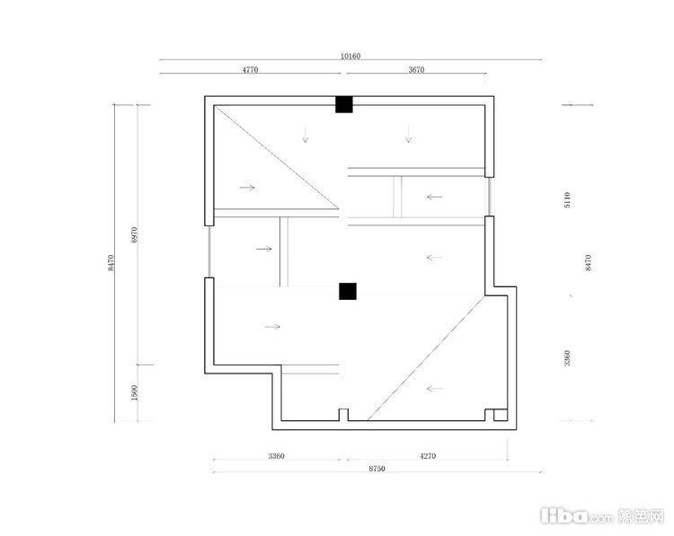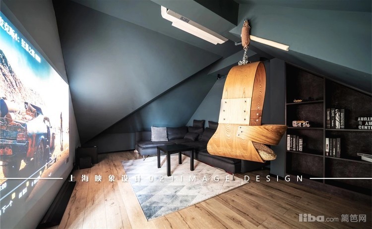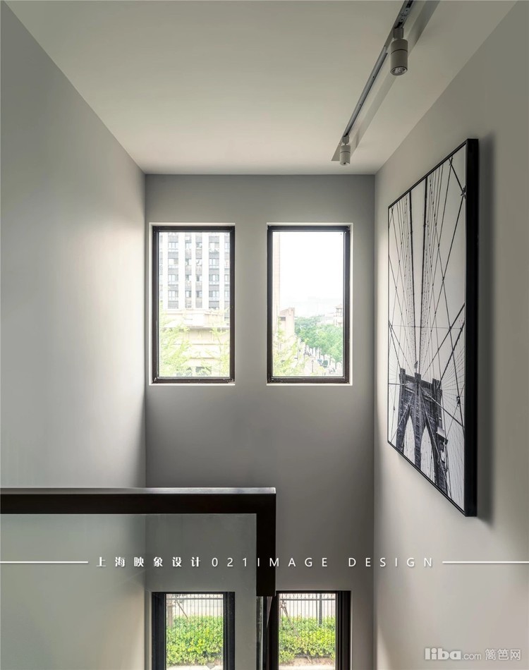 以黑色线条纵横空间的顶面与墙面中,顶面暗藏着黑色轨道筒灯,不再选用独立主灯作为主要的照片来源。黑色轨道在顶面产生几何图形,早已丰富了顶面空间的格局。