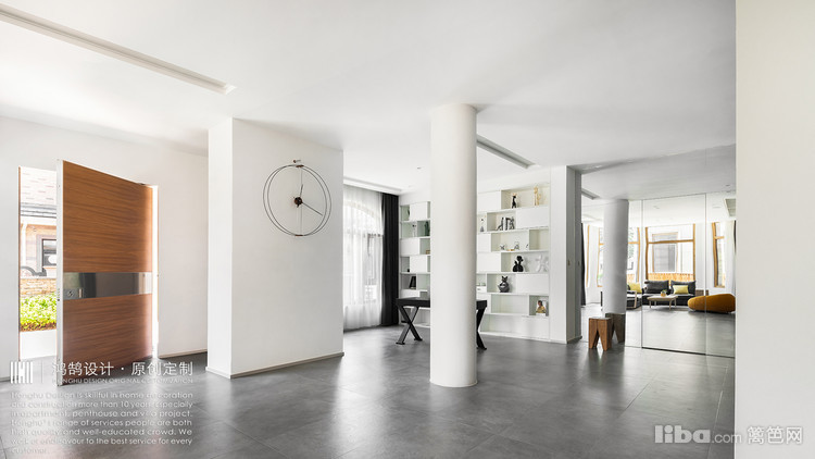 用材配色上我们遵循意式极简风的设计思路,整个空间以黑白灰色为基调,配合部分暖灰色系的木饰面,描绘出现代的底色,纯白色的圆柱子恰如其分的将空间分为两个部分,既相互融合又相互分割。