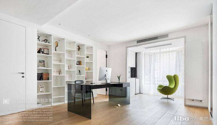 办公区域和客厅融合一起,书桌椅背后的整面墙被设置为书架,设计考究除了给人带来超强的视觉感之外,也与整个空间融为一体,一边孩童玩耍,一边桌前办公,整个空间营造独特的生活感受。