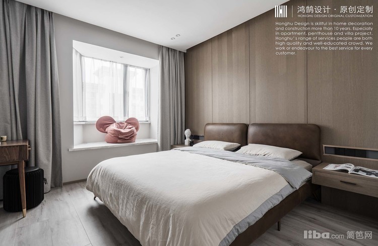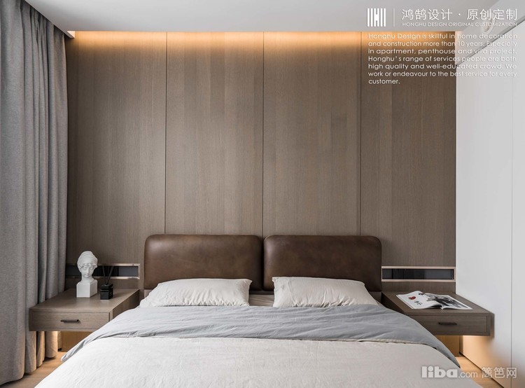 卧室床头背景墙沿用餐厅胡桃木饰面,床头柜背景墙一体化设计,柜子是木工师傅现场制作的,加同色木饰面贴皮。卧室照明主要以氛围灯为主,床头起夜灯+背景氛围灯+吊顶射灯组合实现照明效果。