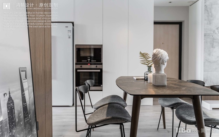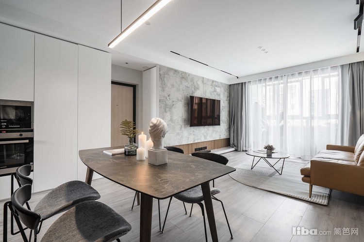 入户即餐客厅,南北通透的户型,结合良好的采光环境,非常明亮舒适。整体硬装基底干练、纯粹,没有过多隔断遮挡,把活动空间充分地释放了出来。