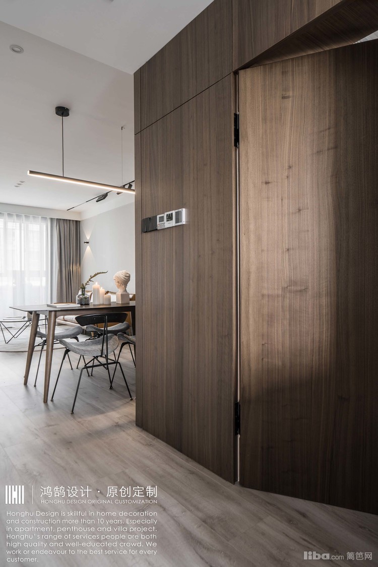 女儿房进门采用隐形门处理,外墙面胡桃木实木饰面裁切铺贴,高度与门缝对齐转角延伸至餐厅。