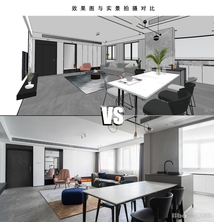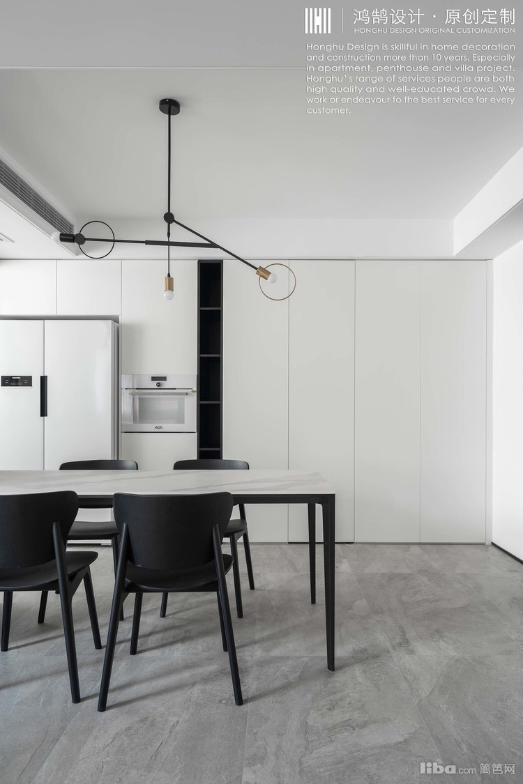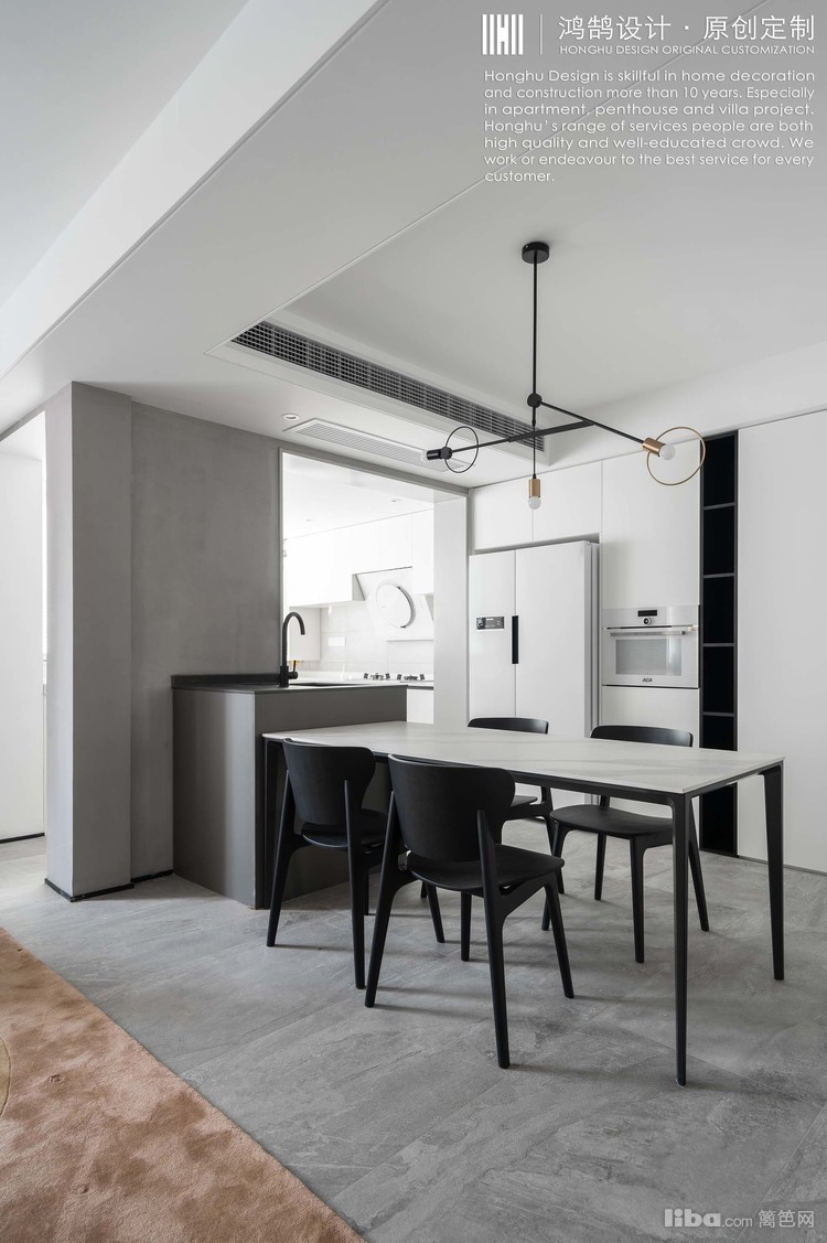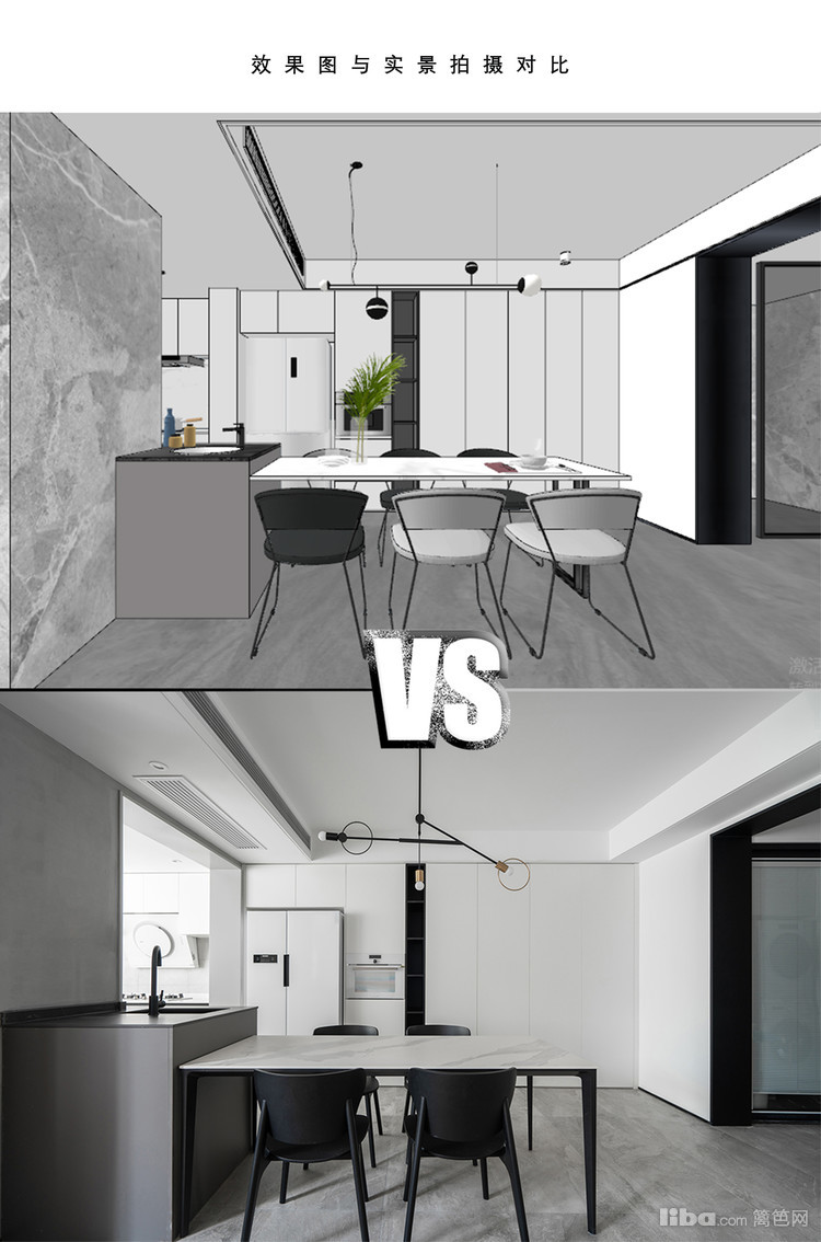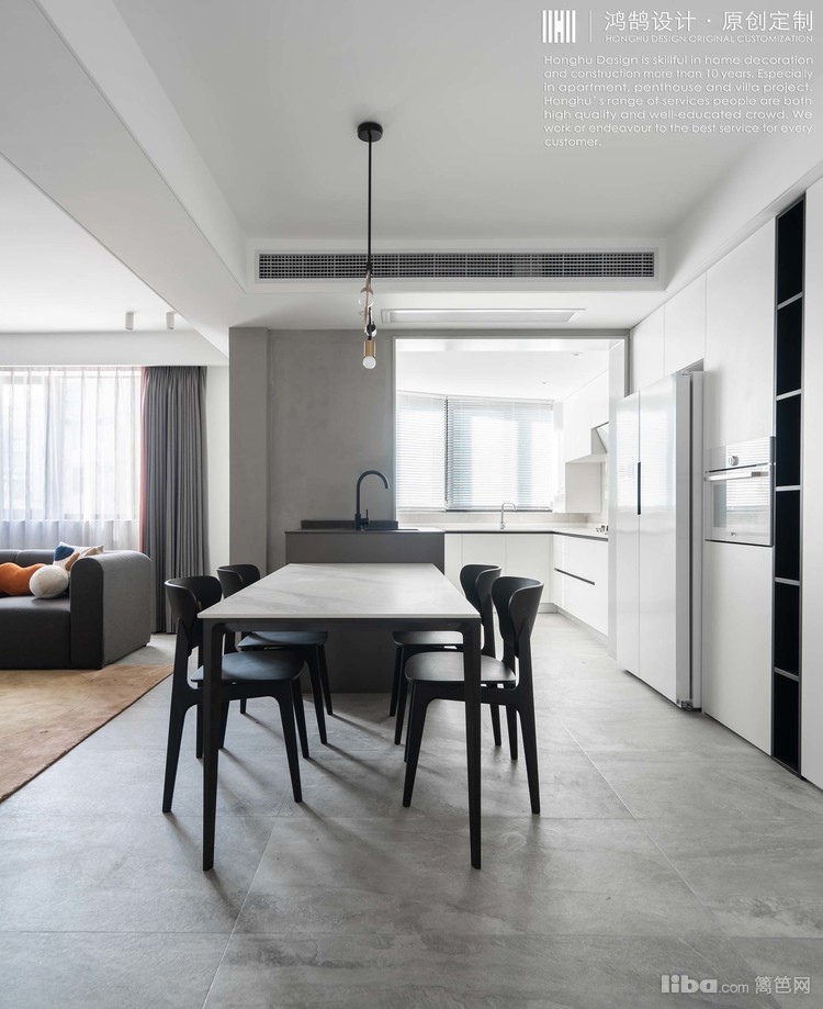 餐厨区黑白灰配色,在厨房、餐厅、客厅的过渡墙体上选择水泥漆涂料,与地面水泥色瓷砖很好地连接了起来。餐桌+岛台的组合形式,可以作为女业主的西厨料理区所使用。