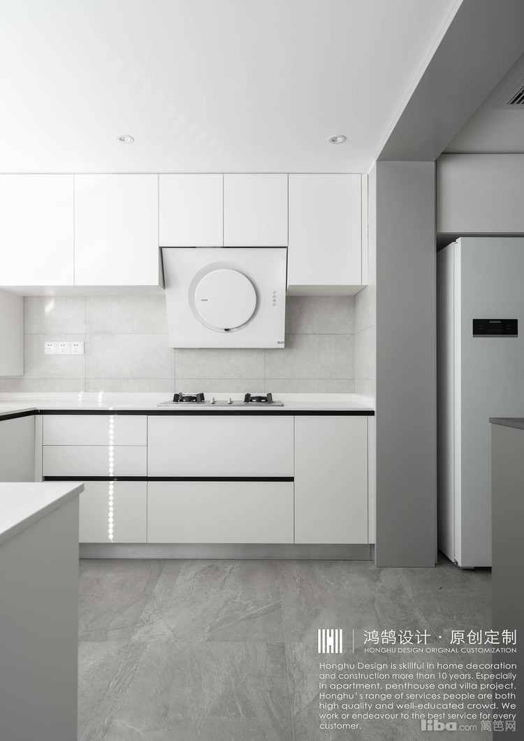 厨房原先的烟道包裹在餐边柜内,柜子集成了烤箱与冰箱功能,公共区域的储物需求得到了保证。高柜门板无把手设计,通过安装反弹器的按压方式开合,大面积选择白色简洁耐看,日常生活也比较好打理