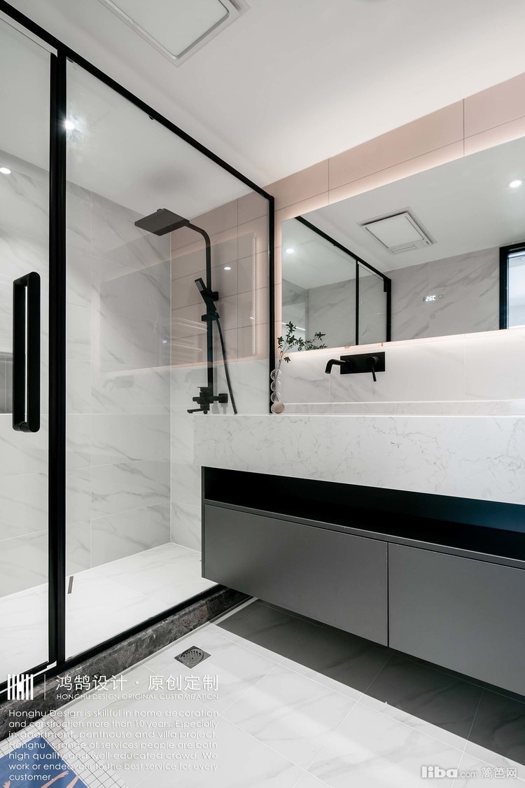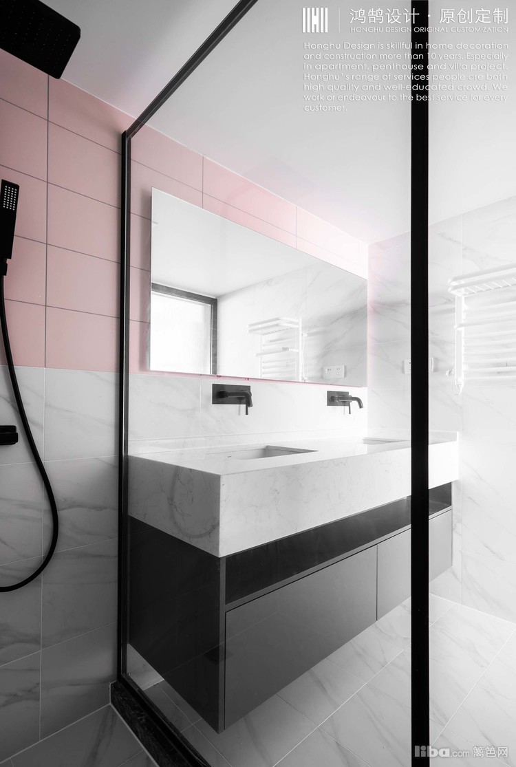 主卧套卫的墙面砖使用仿爵士白大理石瓷砖+粉色砖拼色,卫浴的款式上选择黑色细线条款式,简约与时尚感并存。