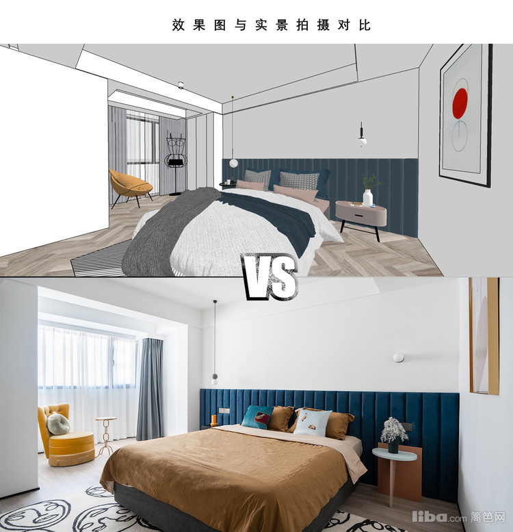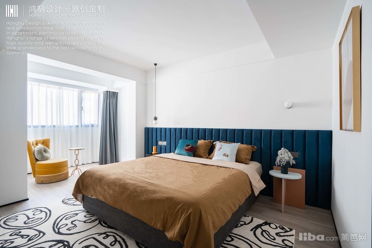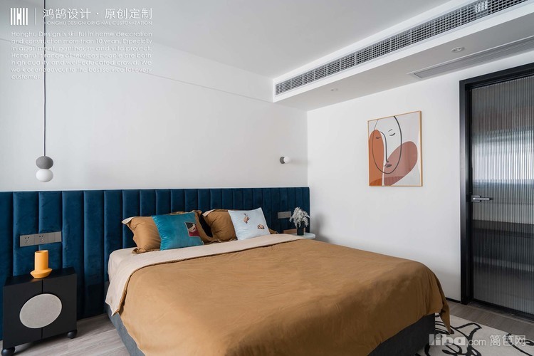 根据女主人个性喜好提取了丰富的色彩与时尚感元素,主色调蓝色+黄色撞色搭配,具有时尚轻佻气息,表达着居住者的个性与审美。床头背景做了半墙软包,加上无靠背床与之搭配,整体感觉柔软舒适。
