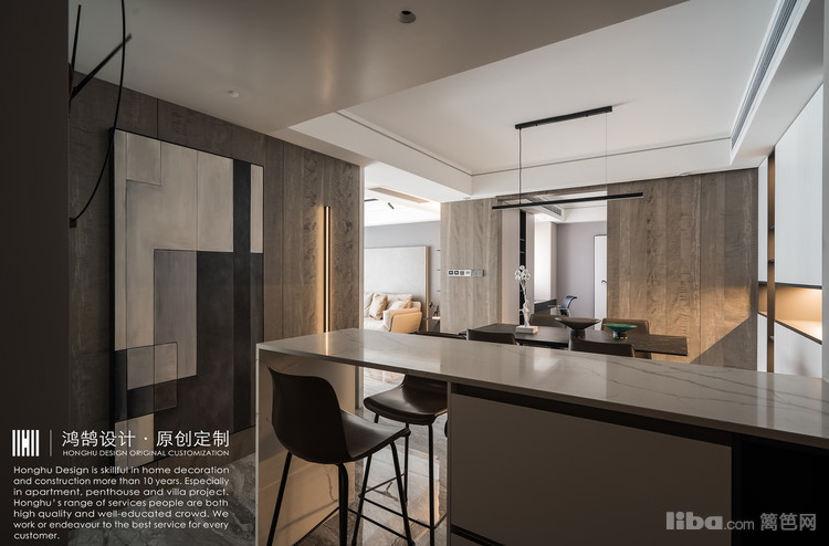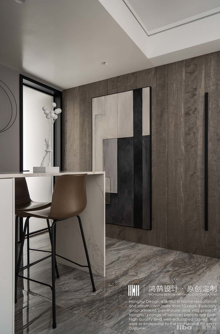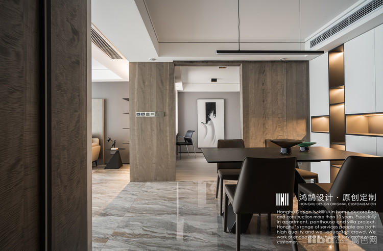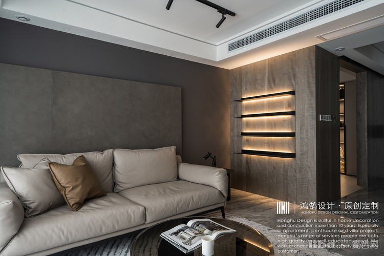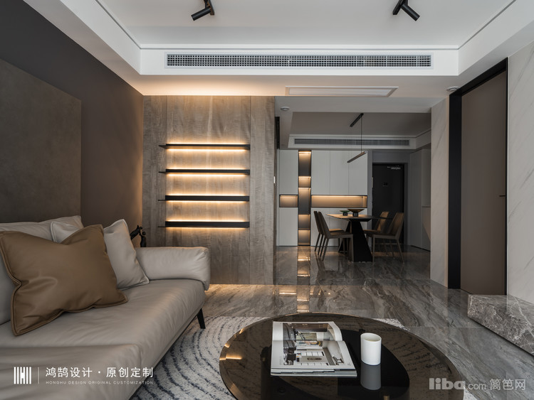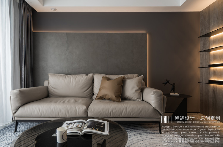 将整案定义为现代轻奢风格,硬装方向以大地系灰咖基调为主,金属、石材等元素通过线条、块面形式合同运用