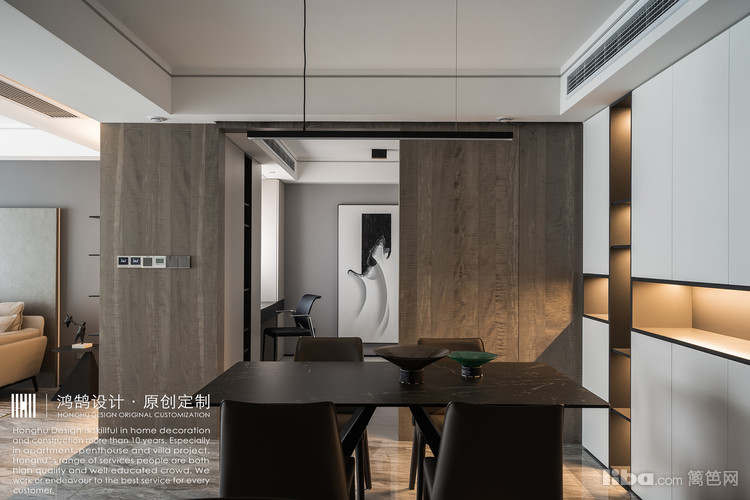 书房作为多功能房使用,加大了门洞宽度,使用移门开合方式,方便日常生活使用。整墙木饰面材质与全屋色调统一,平时关上移门,可以将这个空间很好地隐藏起来。