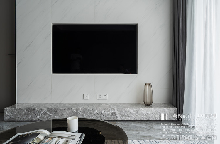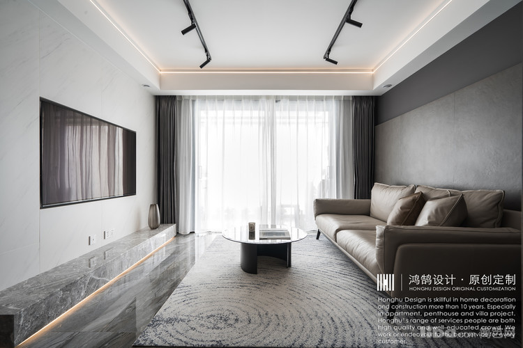 大理石地台代替传统电视机柜,更加简洁美观。并且与地面预留了高度,暗藏灯带辅助光源