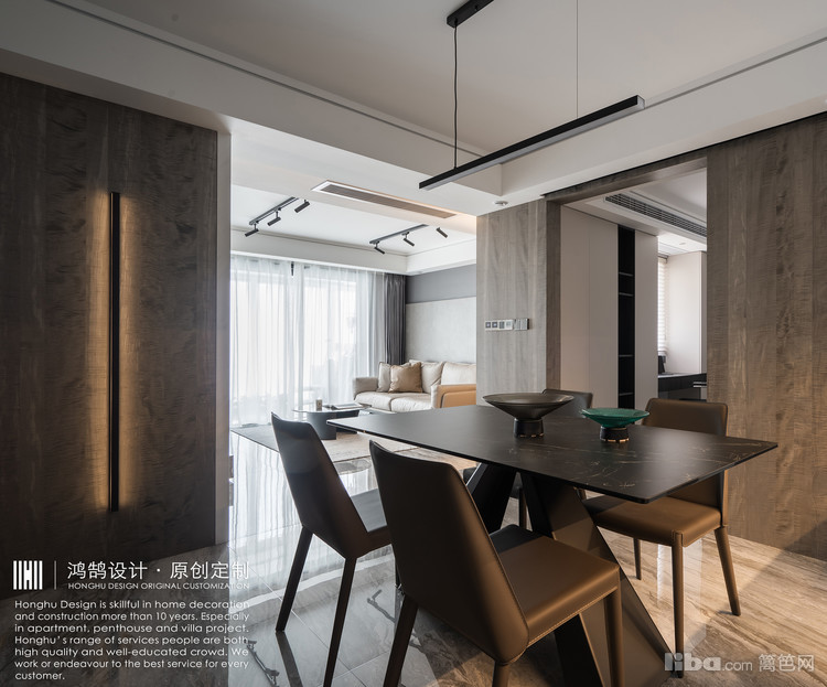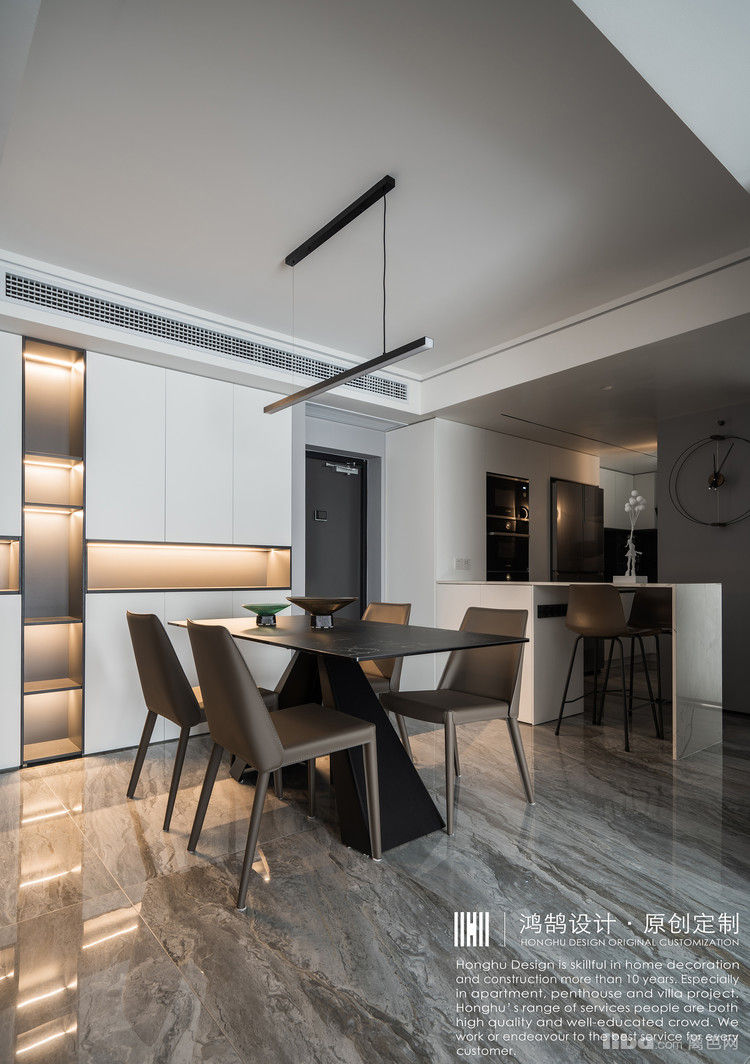 餐厅与门厅在同一块区域,与开放式厨房之间用吧台相隔,整个空间融合在一起,显得更大一点。餐桌以超薄哑光黑岩板作为台面,配合简洁的长条黑色线型灯,以轻薄质感的细线条现代感元素为主。