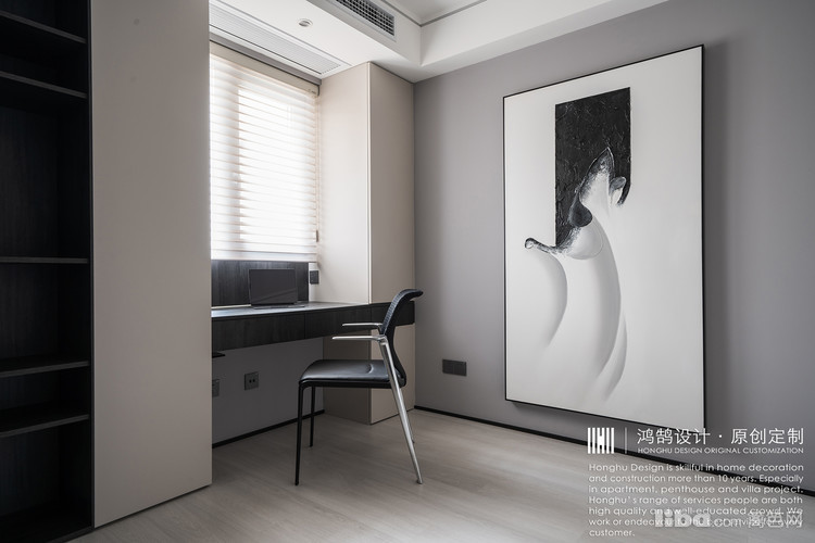 两个柜子+书桌组合美观性与实用性结合。黑白写意装饰画,则弥补了墙面的空缺,起到提亮空间的作用