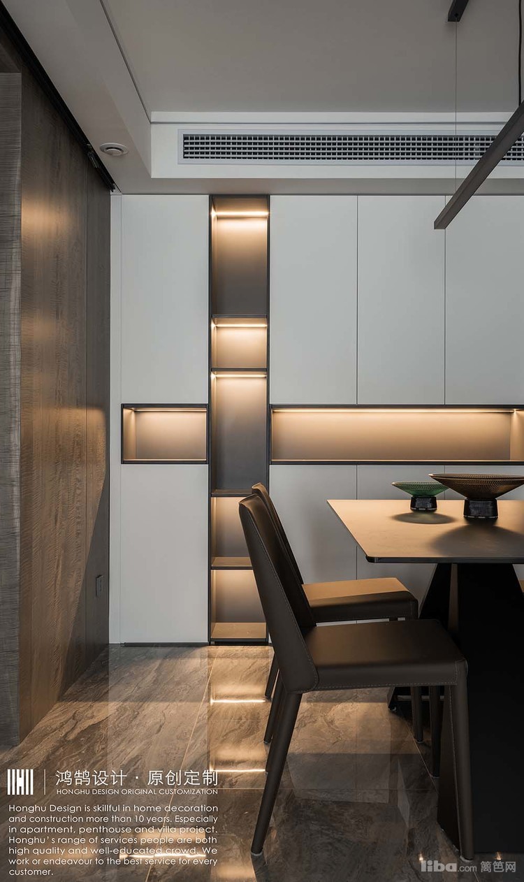 玄关:在进门玄关设计上,以墙面作为玄关端景,线型壁灯是进门第一视觉焦点。配合黑白灰几何装饰画,平衡了墙面的比例,起到呼应作用。灯光与装饰画的组合,让进门的感觉非常具有生活仪式感。