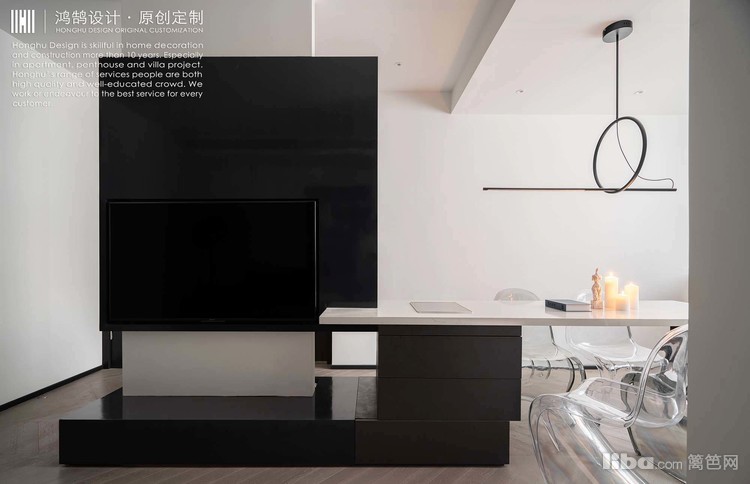 黑色墙板没有做满,上下各留有一定空间,深色不用占据太多,保持色块比例,打造静态平衡之美且满足其功能性