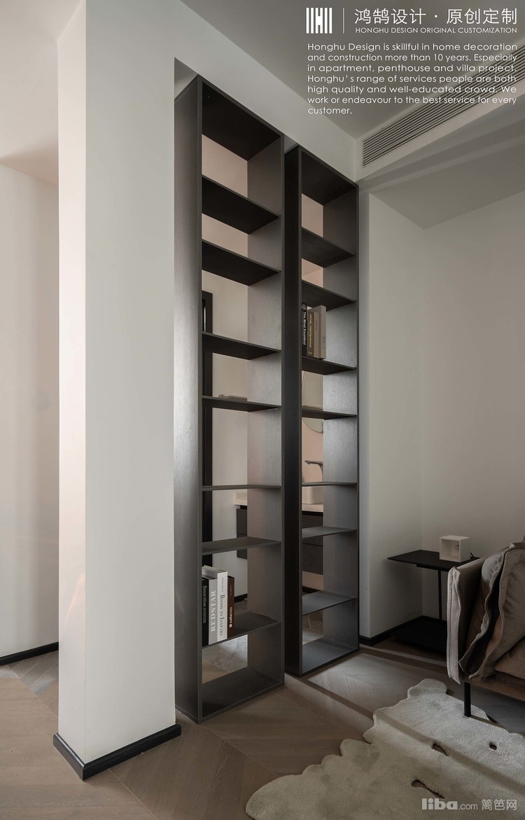 干区与客厅之间的隔断书架主要目的不是为了储物。利用了柱点承重式结构,与干区隔断,来分开两个区域的功能