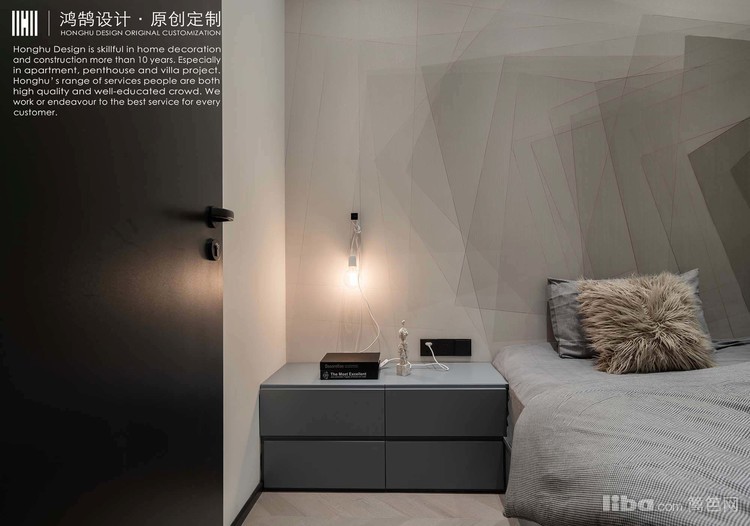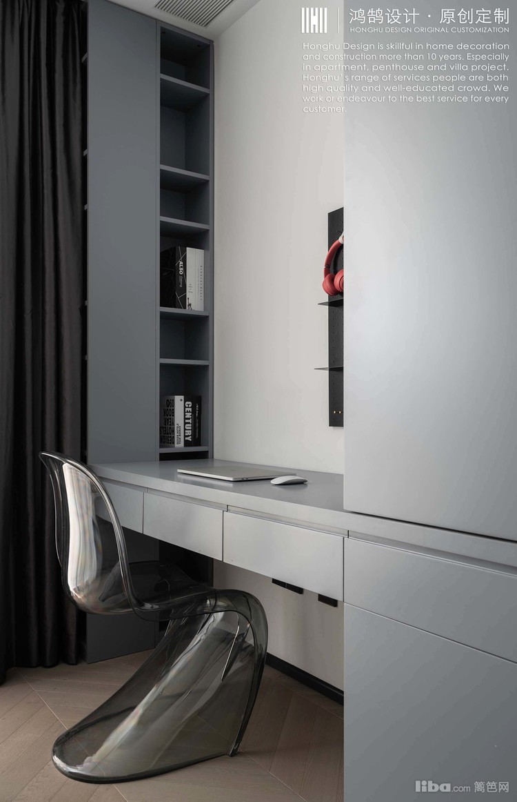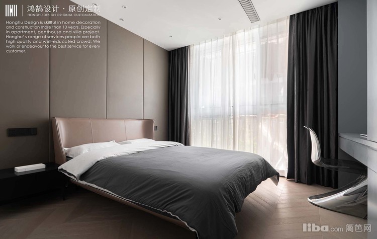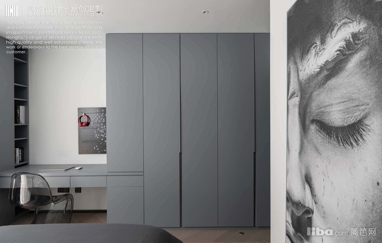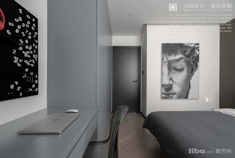 在全屋黑白灰主基调下,卧室咖色硬包背景墙+皮质床,丰富空间的温暖度,简约不失精致感。卧室冷灰色柜子+组合桌,将桌子跟家具组合起来,变为多功能的书桌柜。