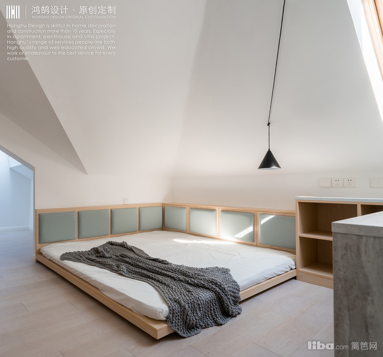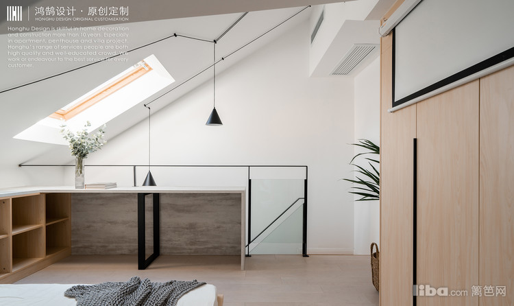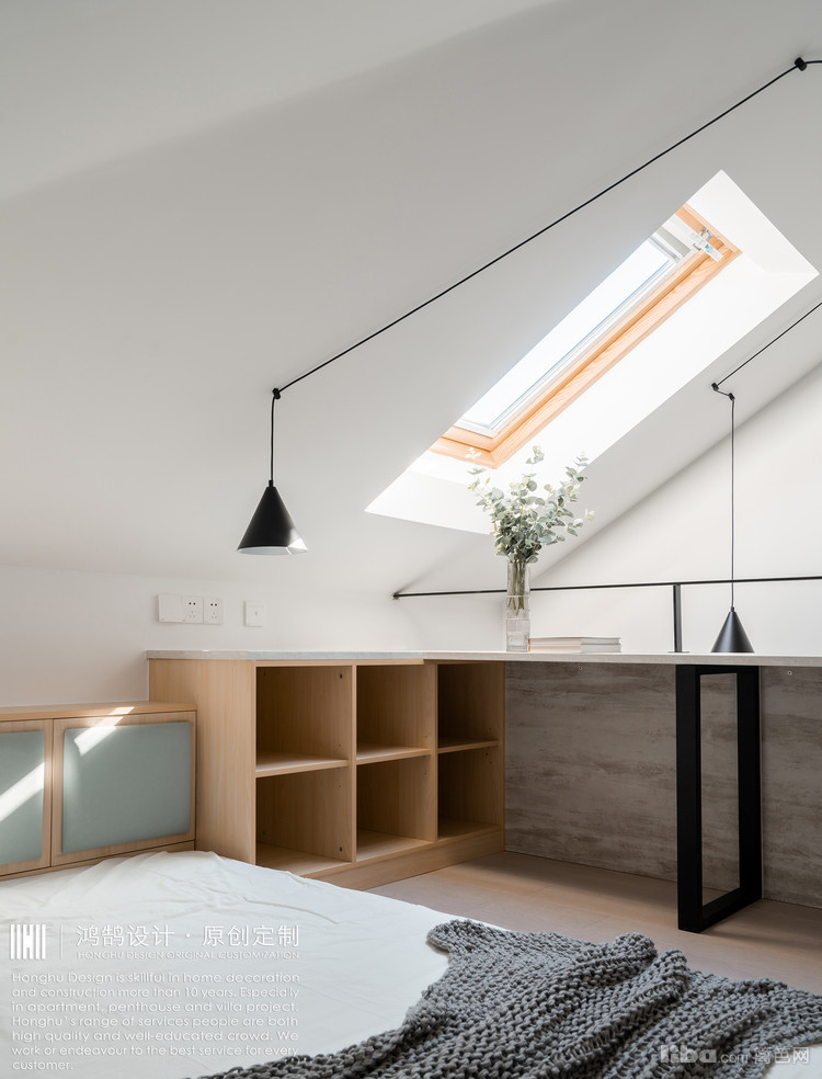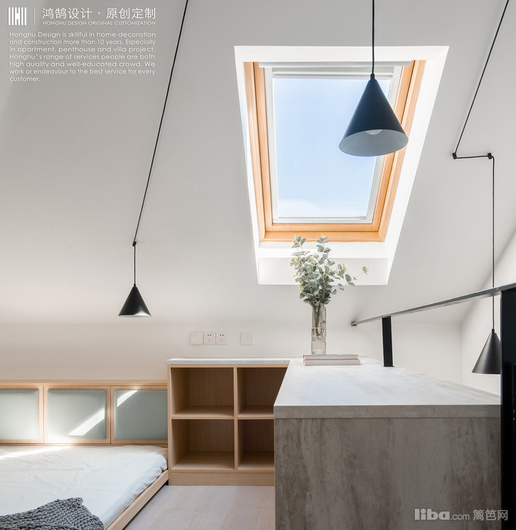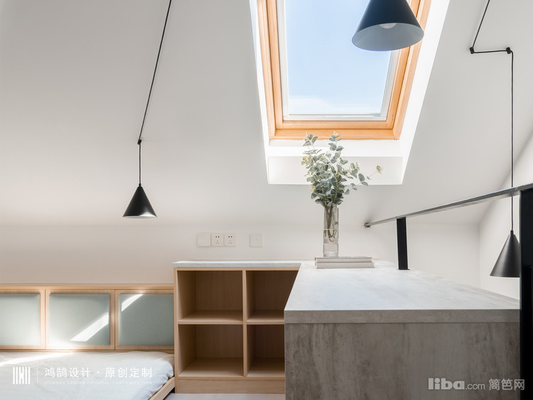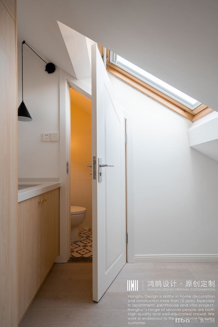 顶楼复式格局,楼上保留原尖顶不规则顶部,做成休闲阅读空间。楼下保留两个房间,父母以后可以随时过来住