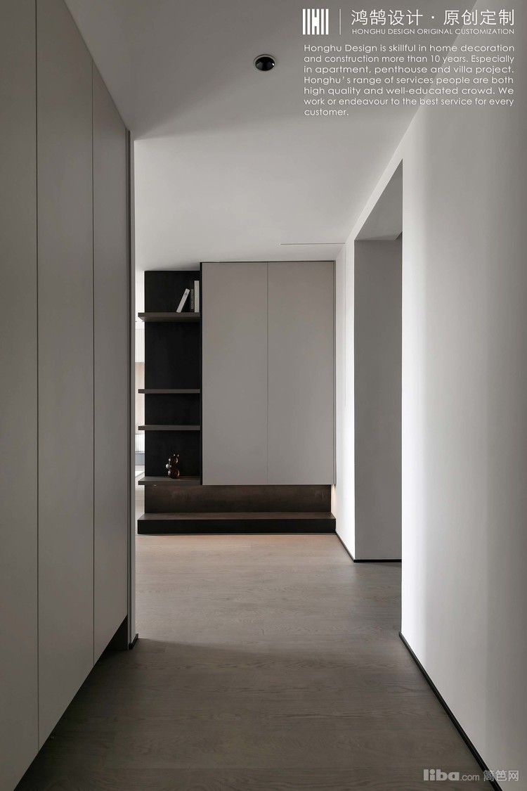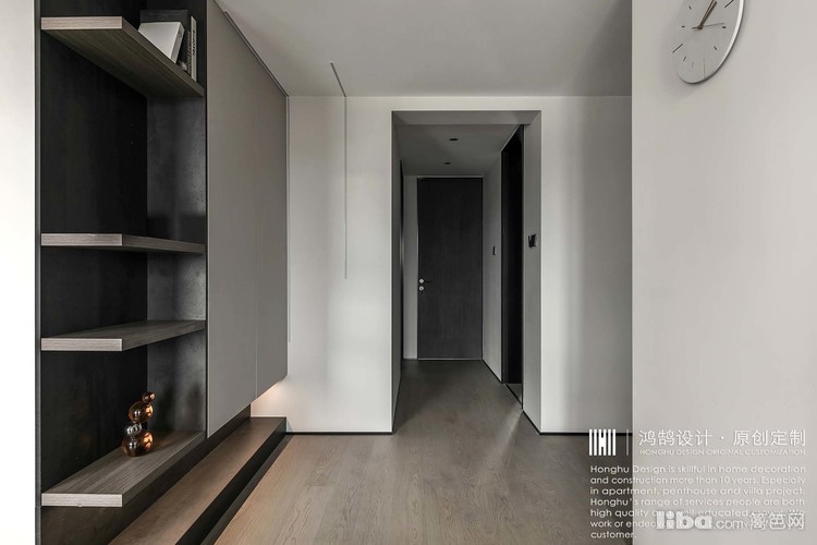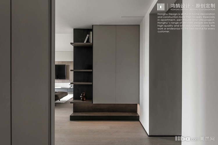 玄关端景柜子+开架组合,不对称设计结合挑空一定高度,客厅光线得到穿透。