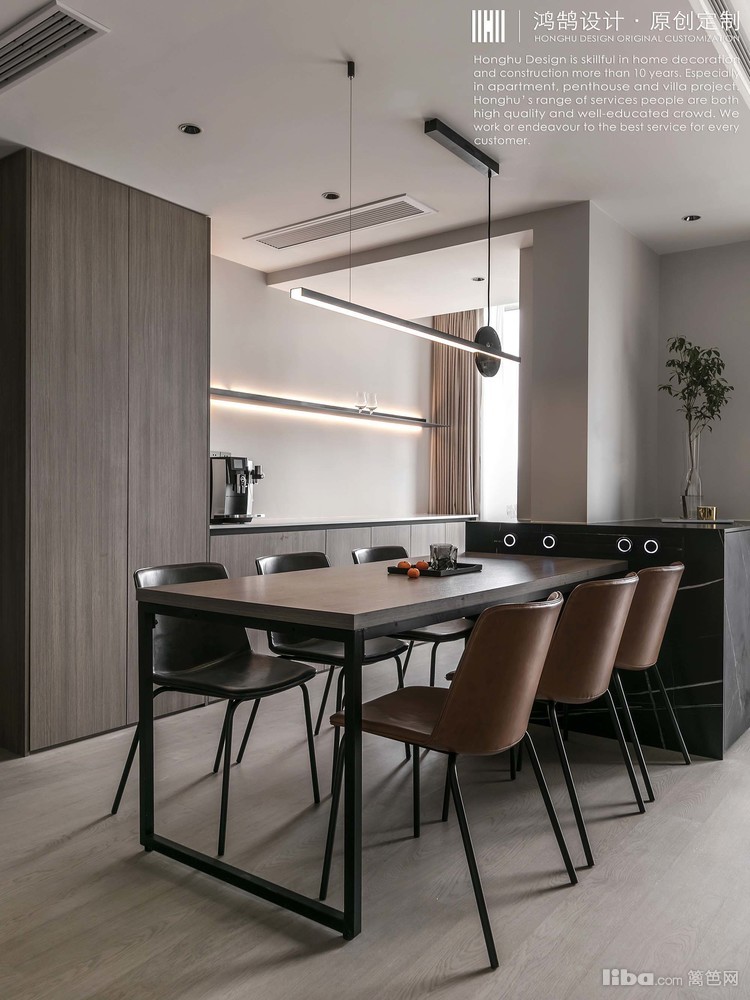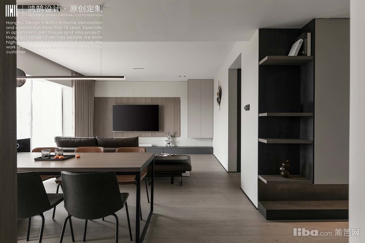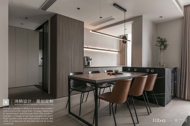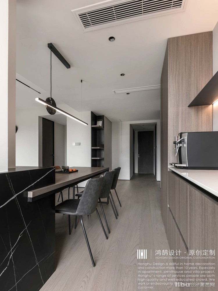 调整后的格局空间感通透,没有墙面隔档客餐厅一体化充分放大了室内的空间。配色方向偏稳重理性色调为主,白色墙面搭配黑色线条,以及纯色木纹面板、岩板组合,颜值与品质兼具,且不容易过时。