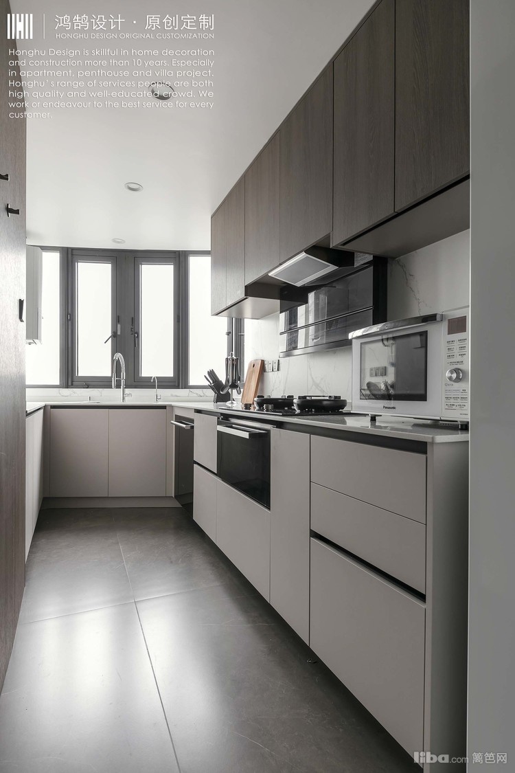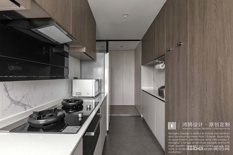 业主做饭频率较高,因此对厨房配置要求更加齐全。采光、台面、收纳空间等需要得到精细化的考量。打通后的格局,移至北阳台区域,首先采光条件得到保证。U型布局,是最为舒适的厨房格局,