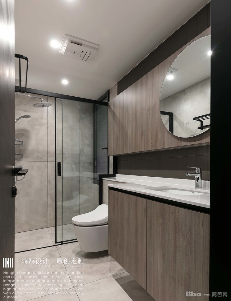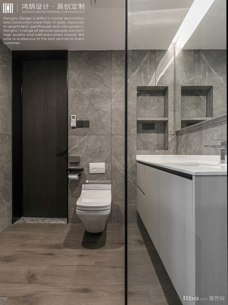 主卫利用小阳台做淋浴房,格局可以隔出主卧衣帽间。墙面600*1200mm尺寸大砖铺贴,地面木纹砖,整体与全屋风格色调统一。
