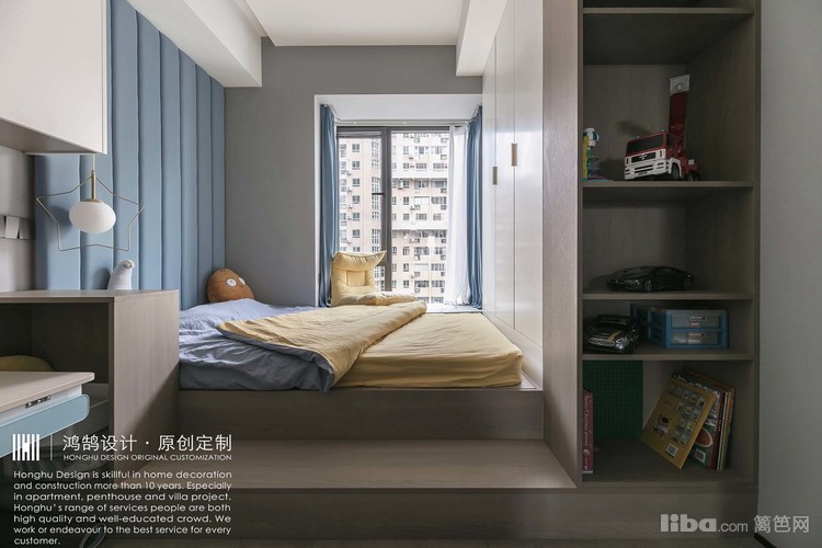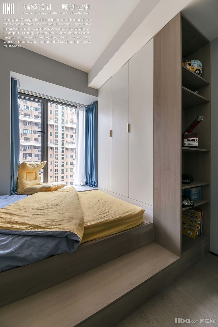 储物区柜子+开架组合,开架深度与地台同宽,可以放置小朋友喜欢的玩具。