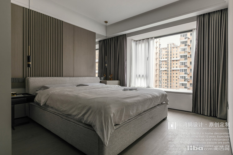 主卧衣帽间采用茶色玻璃增加空间感,床头背景木饰面延伸配暖灰色调乳胶漆,和衣帽间移门相呼应