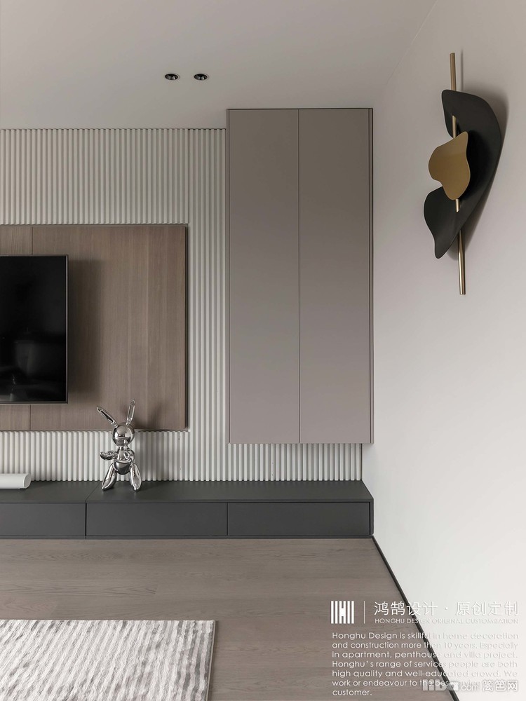 电视背景墙面做造型设计,拉平整体墙面,使得客厅更加方正。定制的灰色格栅烤漆面板具有拉伸纵向空间的视觉感受,木色饰面板拼接组合。储物吊柜充分利用了斜墙的内部空间,兼顾收纳功能性