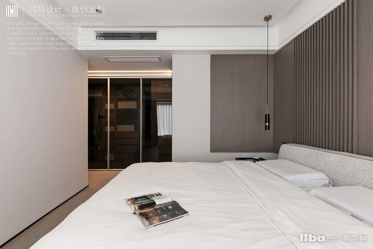 卧室无主灯设计,筒灯作为主要照明方式。吊顶一圈反灯带,作为氛围灯,使用柔和的氛围灯光照明。梳妆台选择定制形式,柜体打钢架与墙面固定挑空,木饰面贴皮与背景墙同材质。