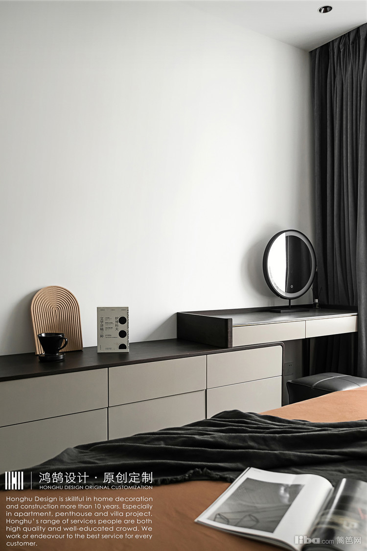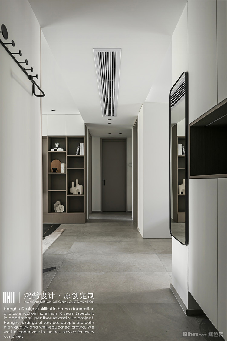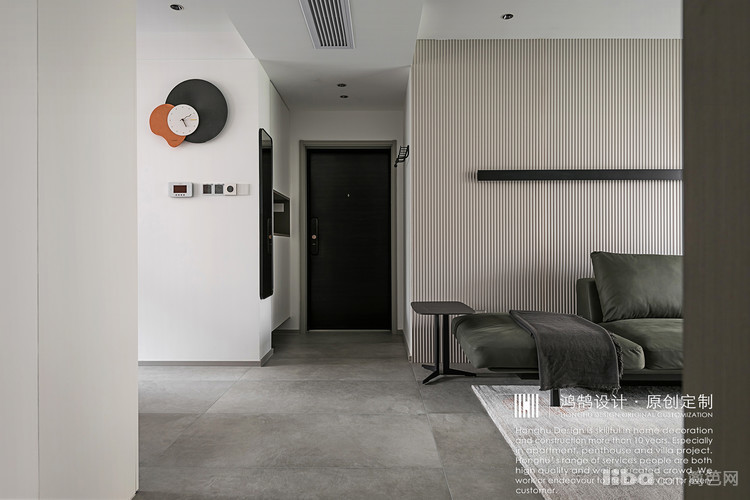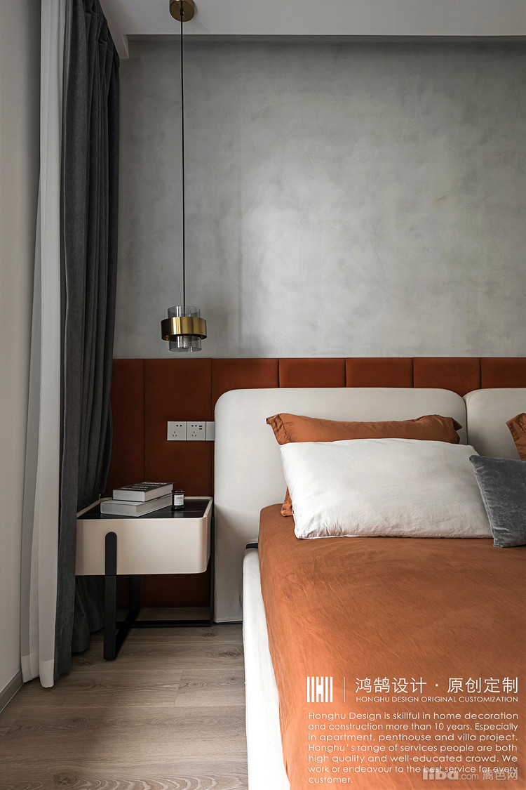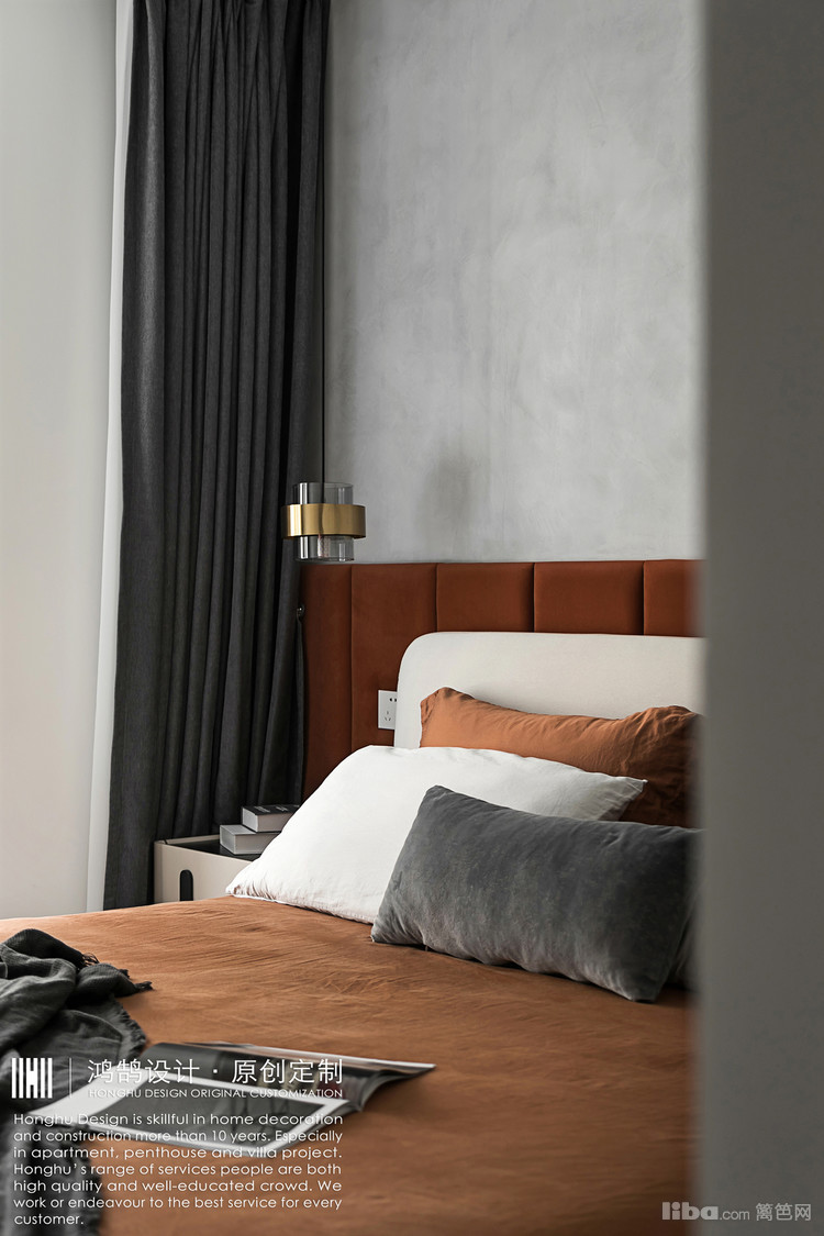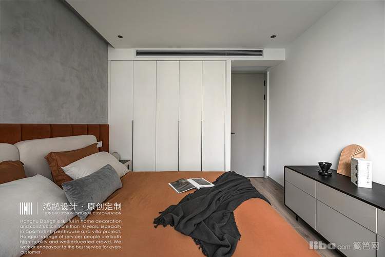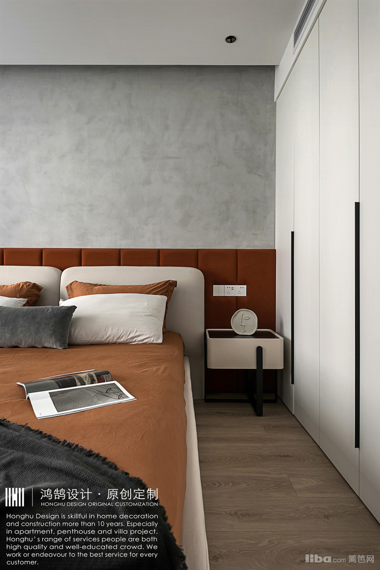 本案例是现代简约风格,整体色调以白色和木色为主,灰色和橙色作为点缀色。
