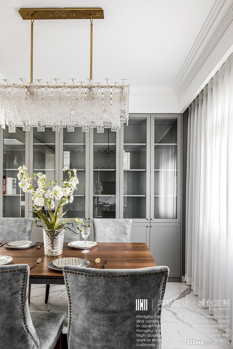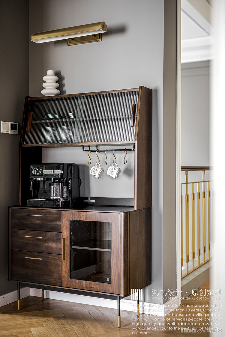业主非常喜欢小酌,所以在餐厅位置设计师设计了一排置酒的透明柜子,方便拿取和收纳。