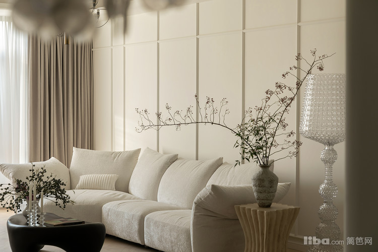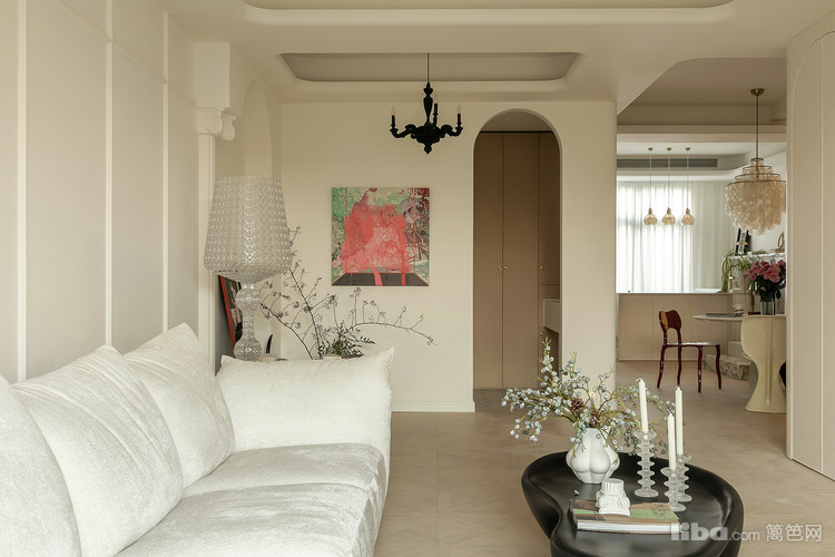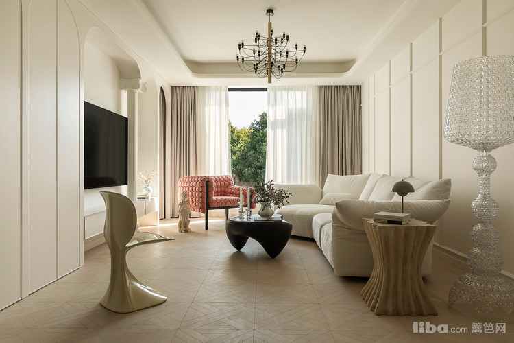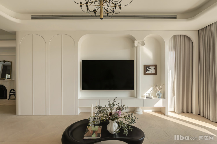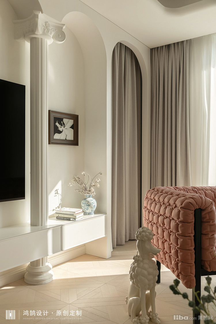 精心组合罗马柱的元素和转角窗帘隐形门的设计,不仅显著提升了电视墙的整体视觉效果,还使得整个顶面呈现出一种圆弧形的优雅线条,为整个空间增添了一种独特的美感。