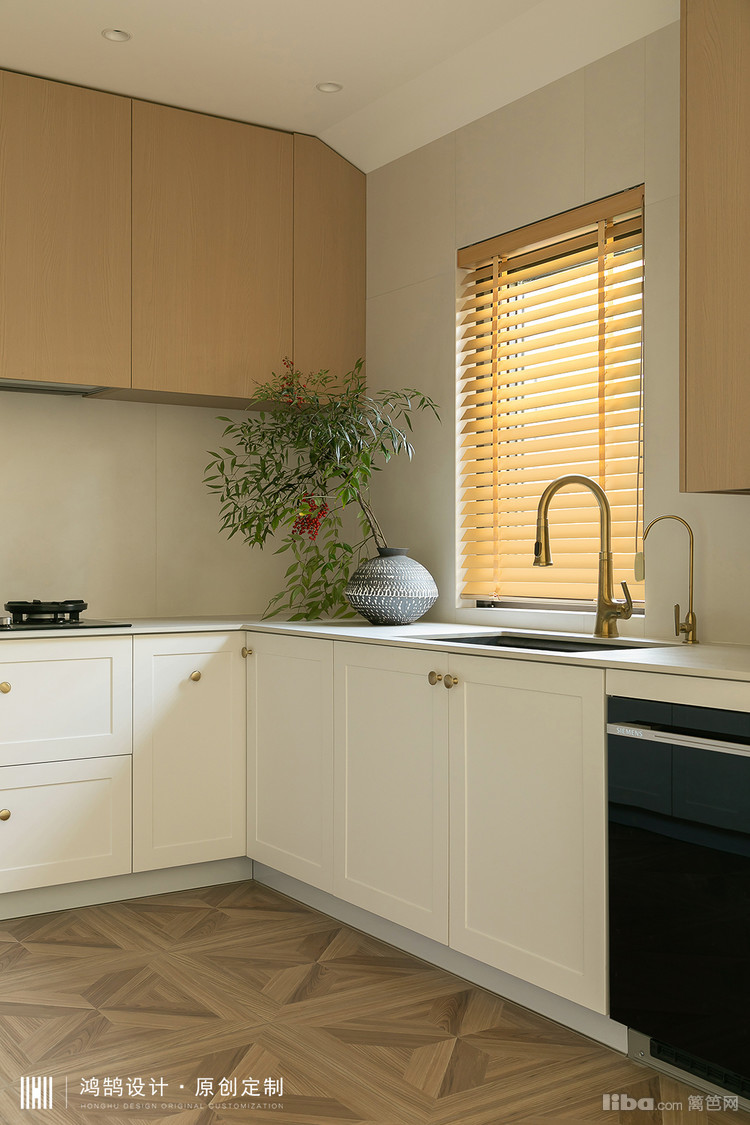 白色橱柜与拼花木纹地砖相结合,为整个厨房空间赋予了优雅的气质提升。橱柜的布局经过精心设计,最大化地利用了每一寸空间