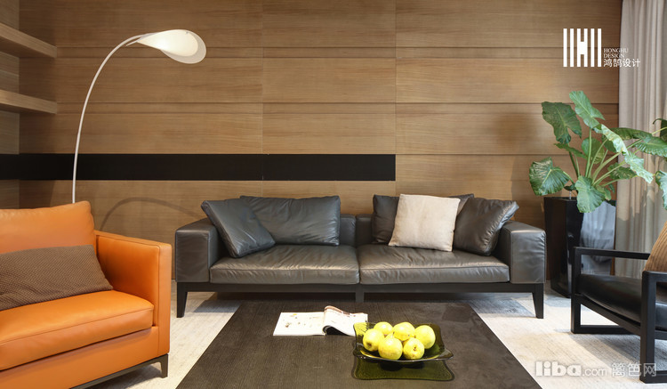大量木質的寬大客廳,角落的簡單的小綠植點綴的恰到好處,很有情調的落地燈,所有的傢具都顯得頗有質感。