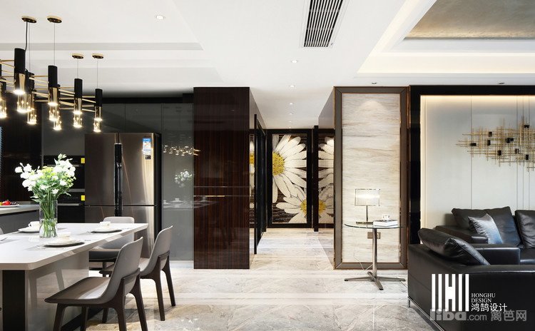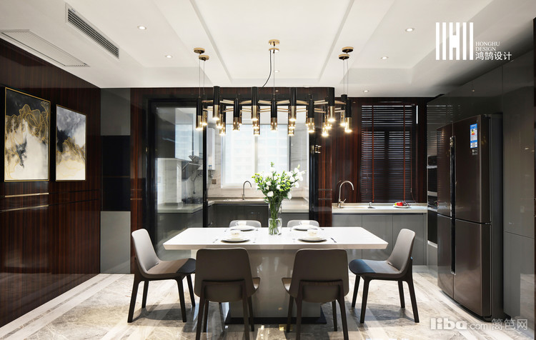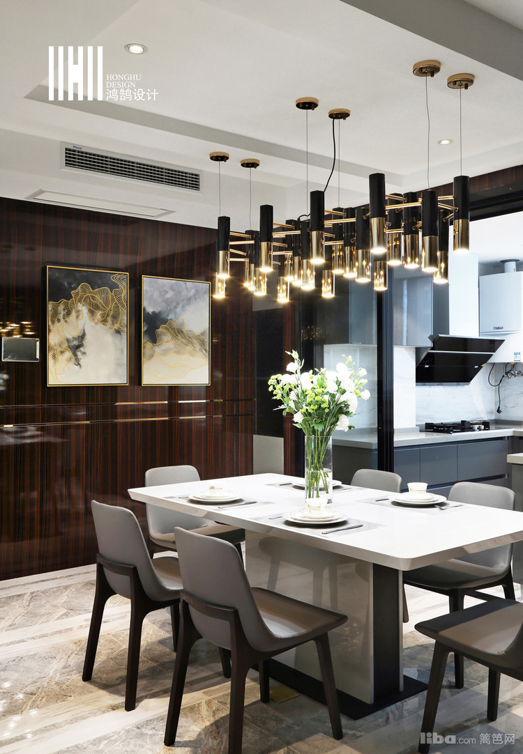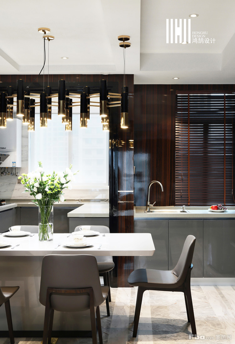 地面铺设方面设计师采用了帕斯高灰和雅士白条状铺贴,彰显了客餐厅的空间。