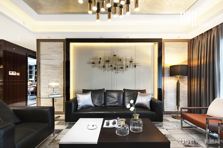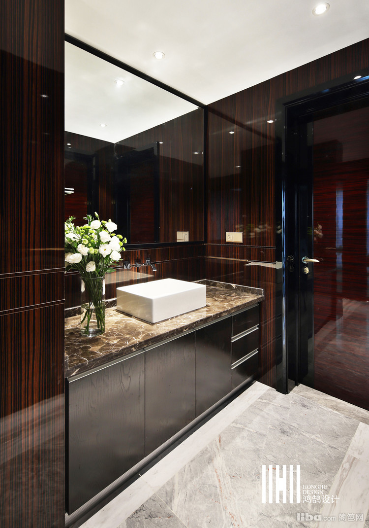 墙面色彩上选用了深色斑马纹墙板、暖灰色硬包与金色不锈钢的色彩组合,营造尊贵典雅的色彩氛围。