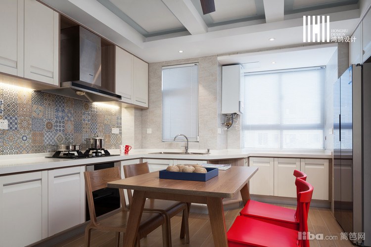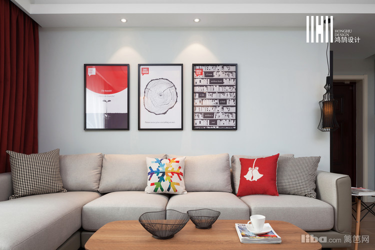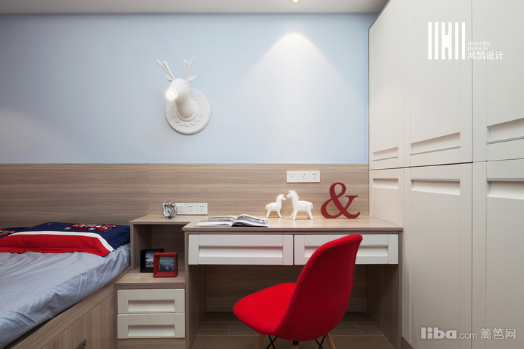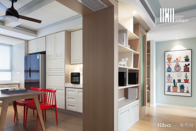 色彩及材质的搭配上,设计师运用原木色搭配白色,软装点缀了红色,丰富了空间