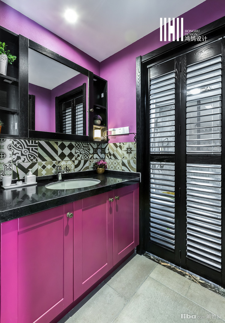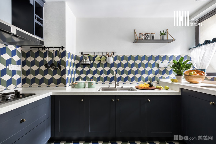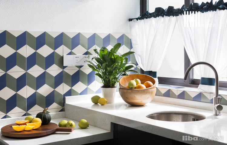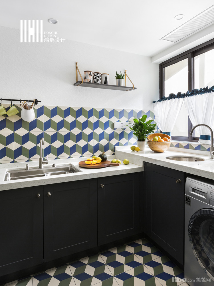 厨房:厨房通过空间改造后变的很大,加上女主人并不是很经常在家做饭,所以把洗衣的功能也并入厨房空间。蓝绿相间的几何花砖搭配黑色的橱柜,让传统的厨房变的新颖又有特色。