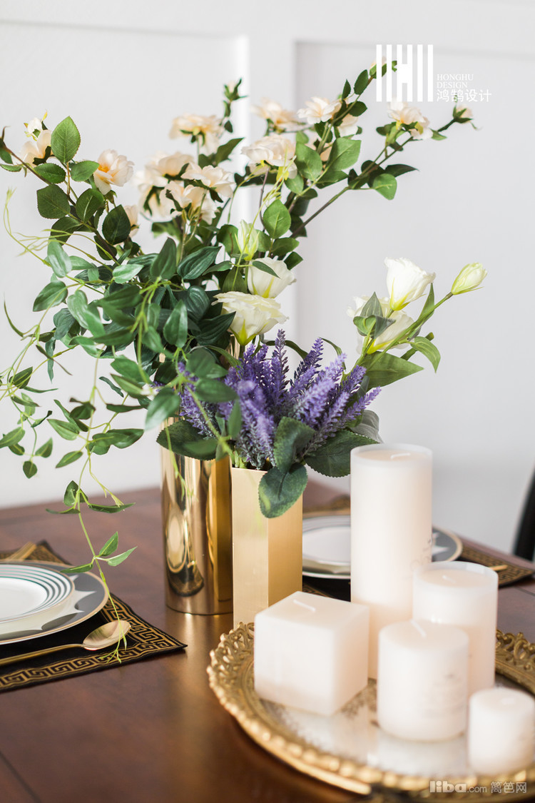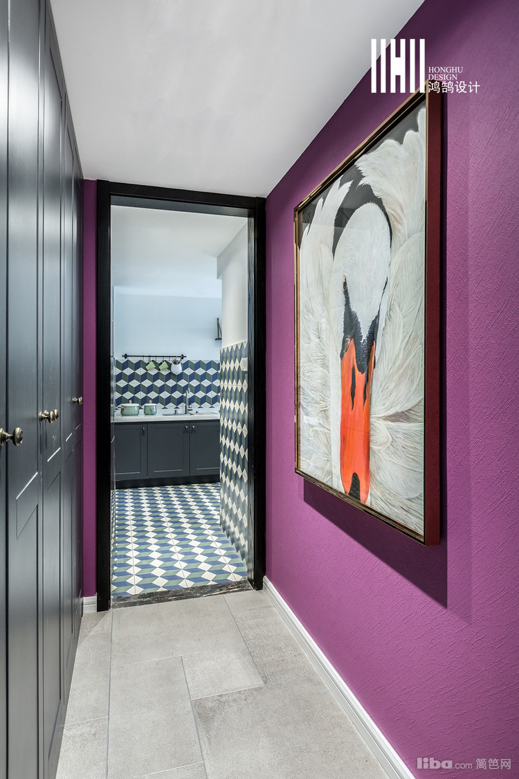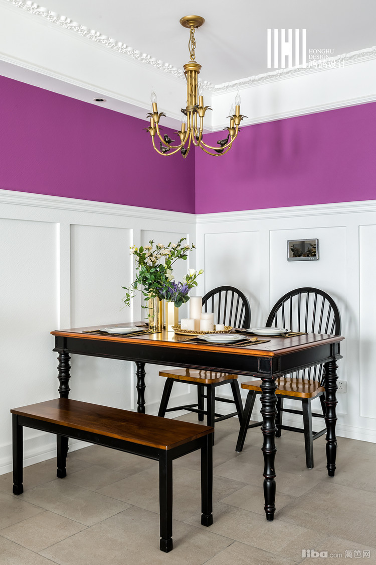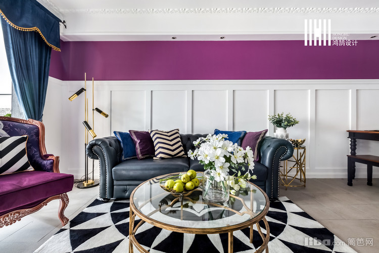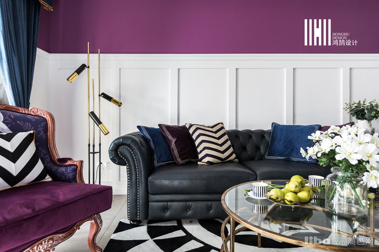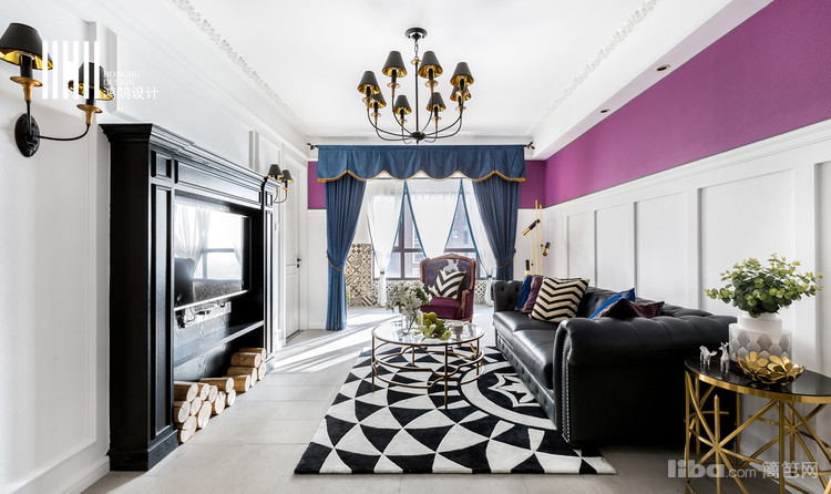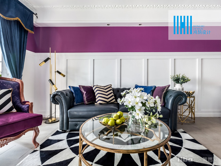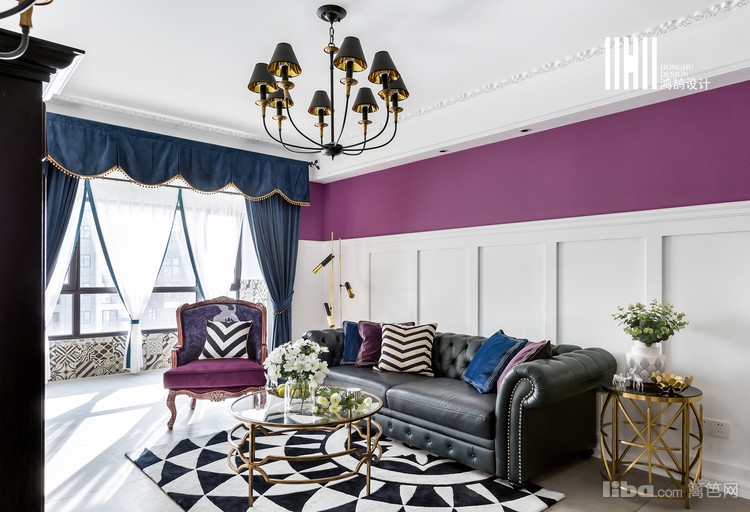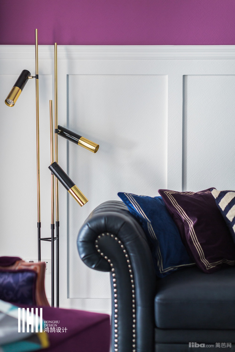 客厅:跳跃的紫色和蓝色的丝绒窗帘,不仅产生强烈的对比和碰撞,而且同时也为空间增加了不少活力。客厅角落,纯黑镶金的落地灯,微微的灯光,温馨的氛围,让人有想快点回家的感觉。