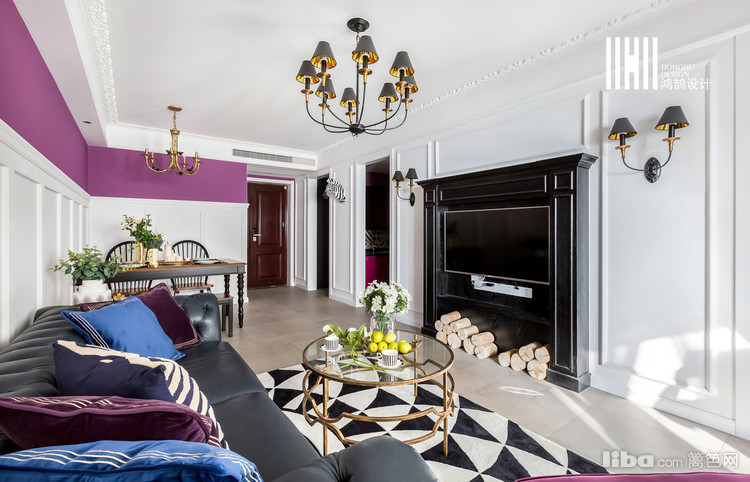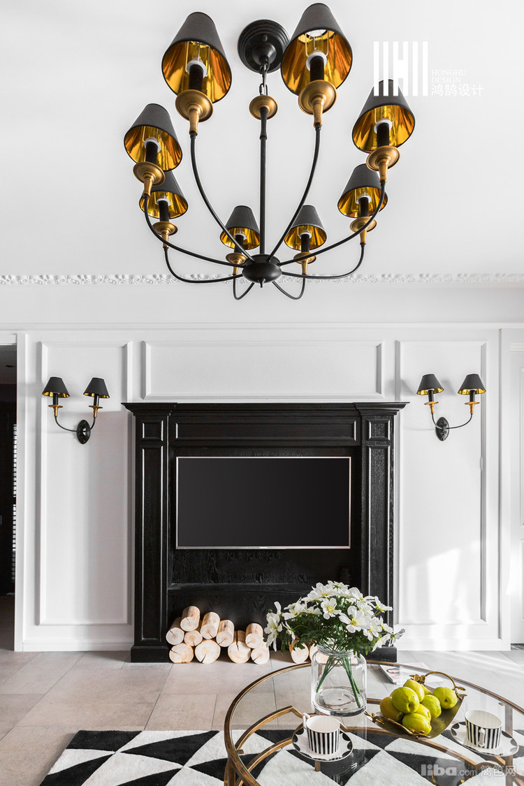 顶面纯白的夸张线条,黑金色复古吊灯搭配纯黑的实木壁炉;