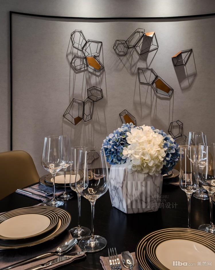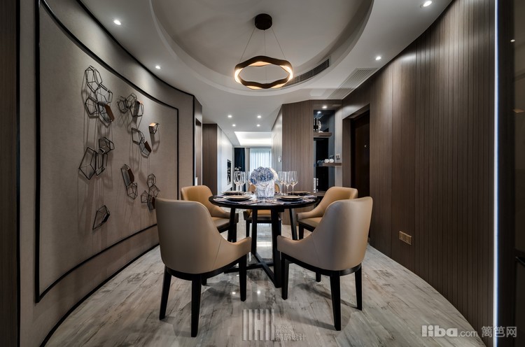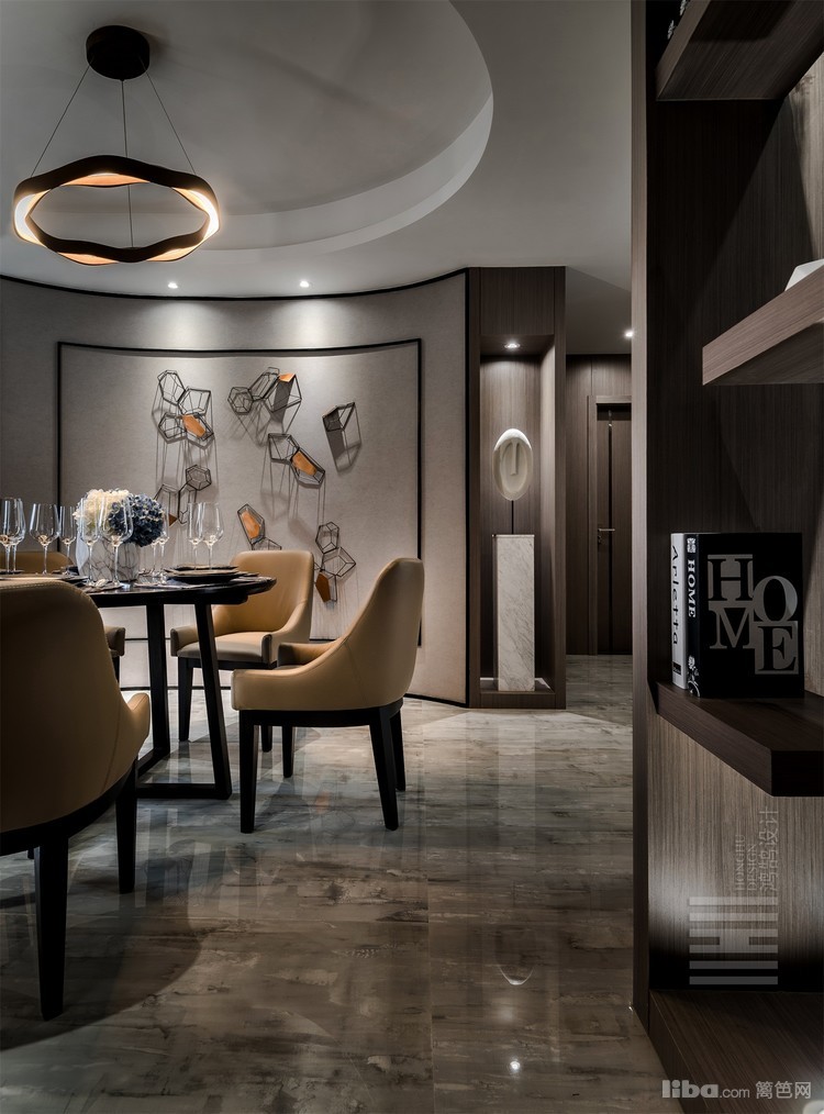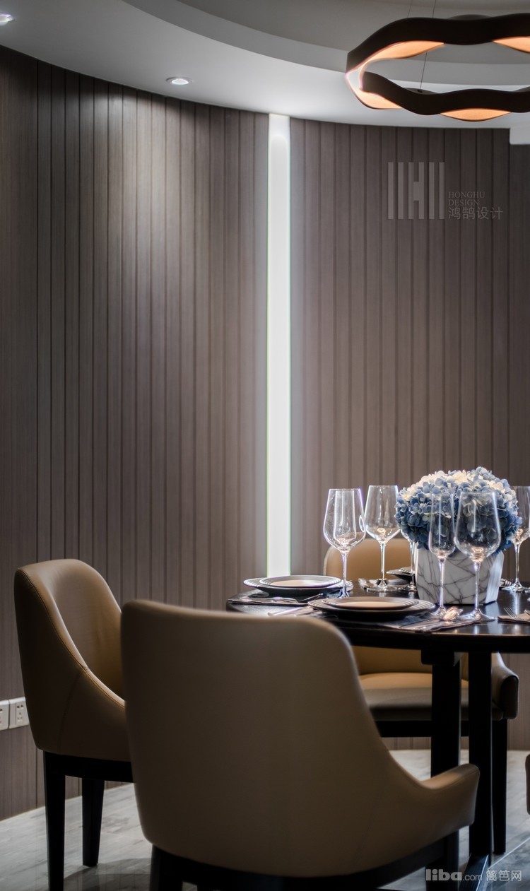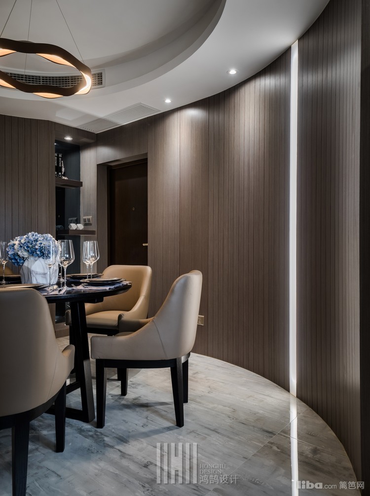 餐厅的弧形背景的饰面板细条分割是为了和灯片的尺寸呼应,椭圆形的餐厅也是整个布局的一个特点