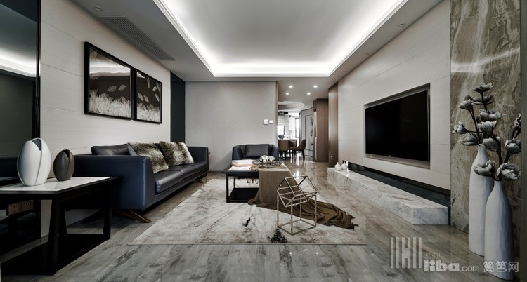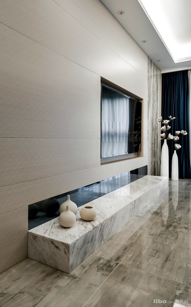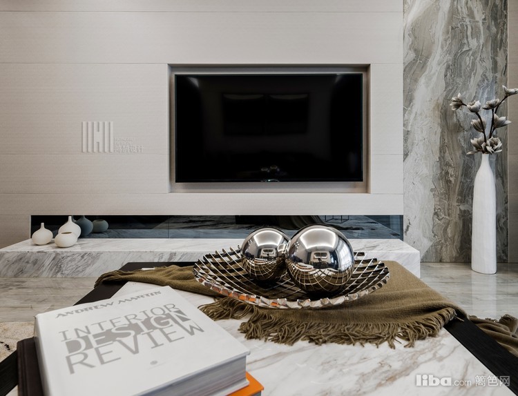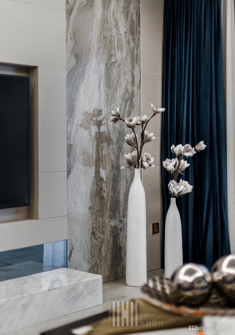 客厅部分采用了,爵士白大理石,灰镜,硬包结合饰面板等常规的材料元素去打造一个比较高冷的客厅